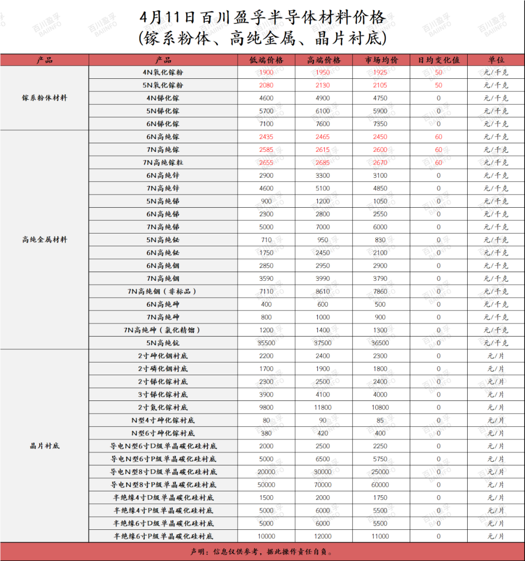 百川盈孚 | 2024年4月11日半导体材料价格 百川盈孚大宗商品参考价格发布