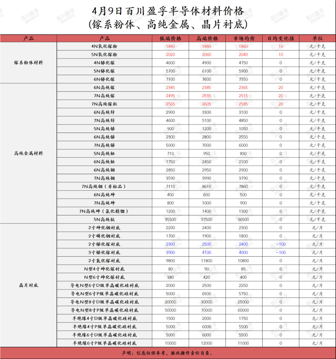 百川盈孚 | 2024年4月9日半导体材料价格 百川盈孚大宗商品参考价格发布