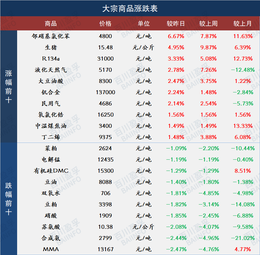 百川盈孚 | 2024年1月29日大宗商品涨跌前十 百川盈孚大宗商品参考价格发布