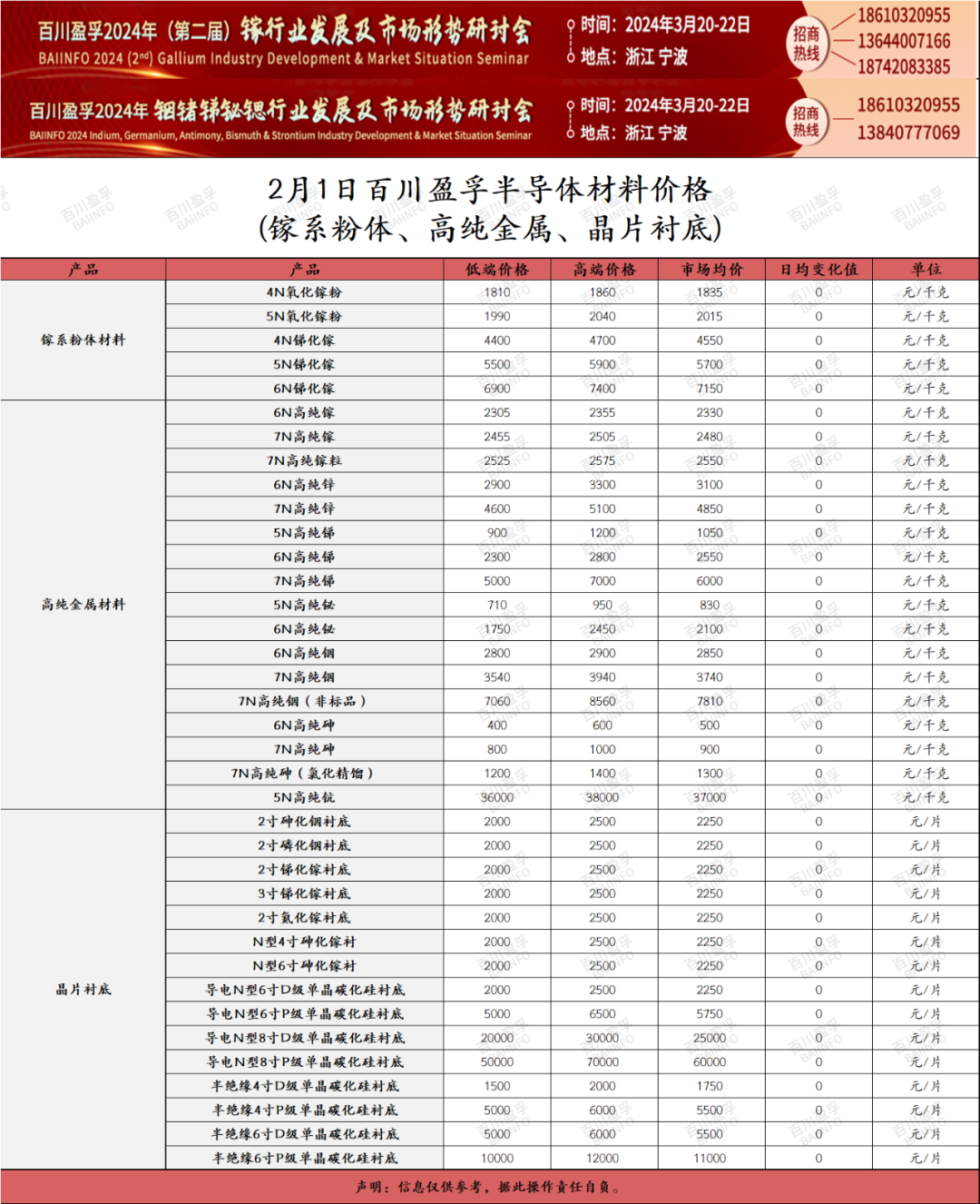 百川盈孚 | 2024年2月1日半导体材料价格 百川盈孚大宗商品参考价格发布