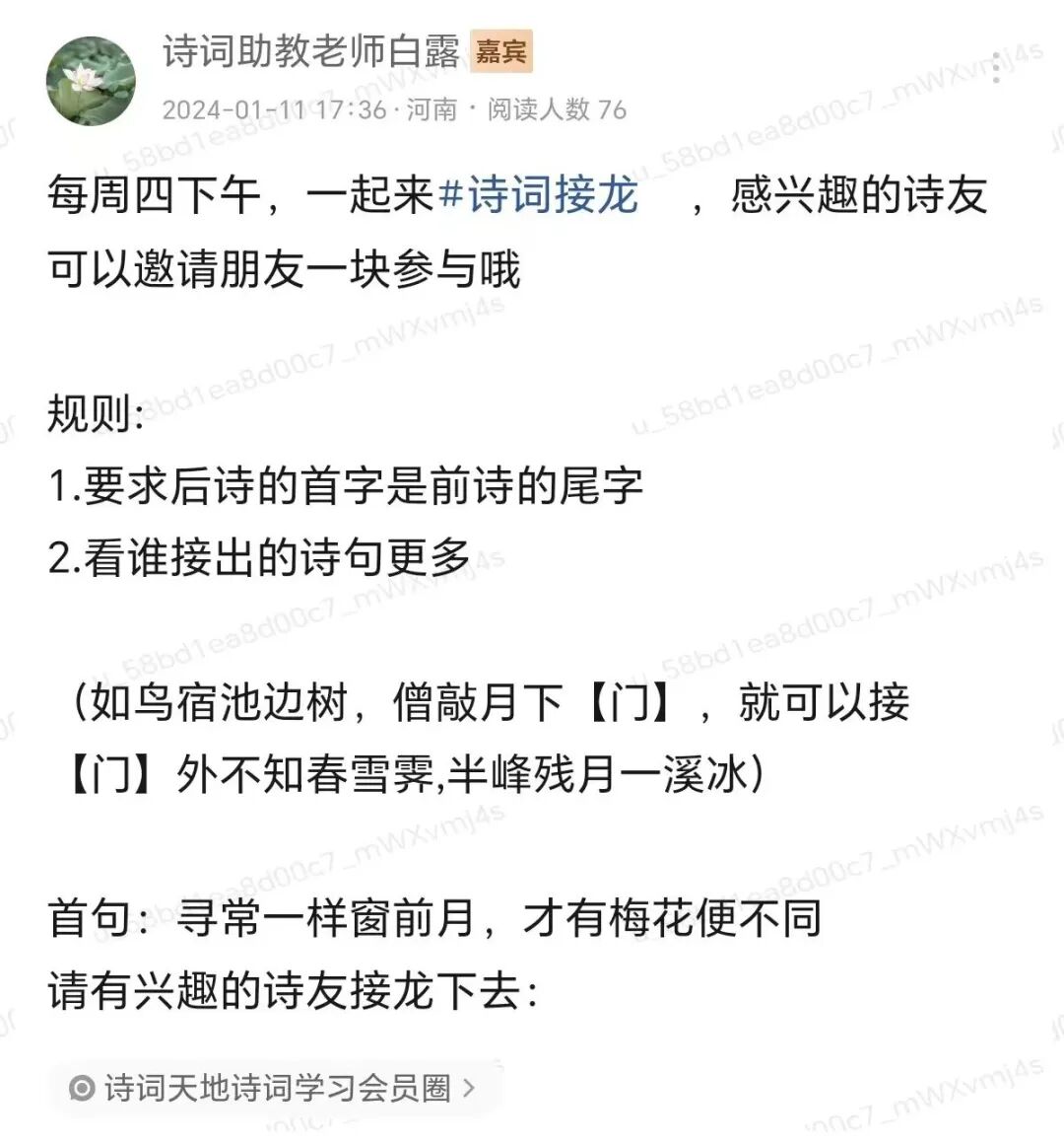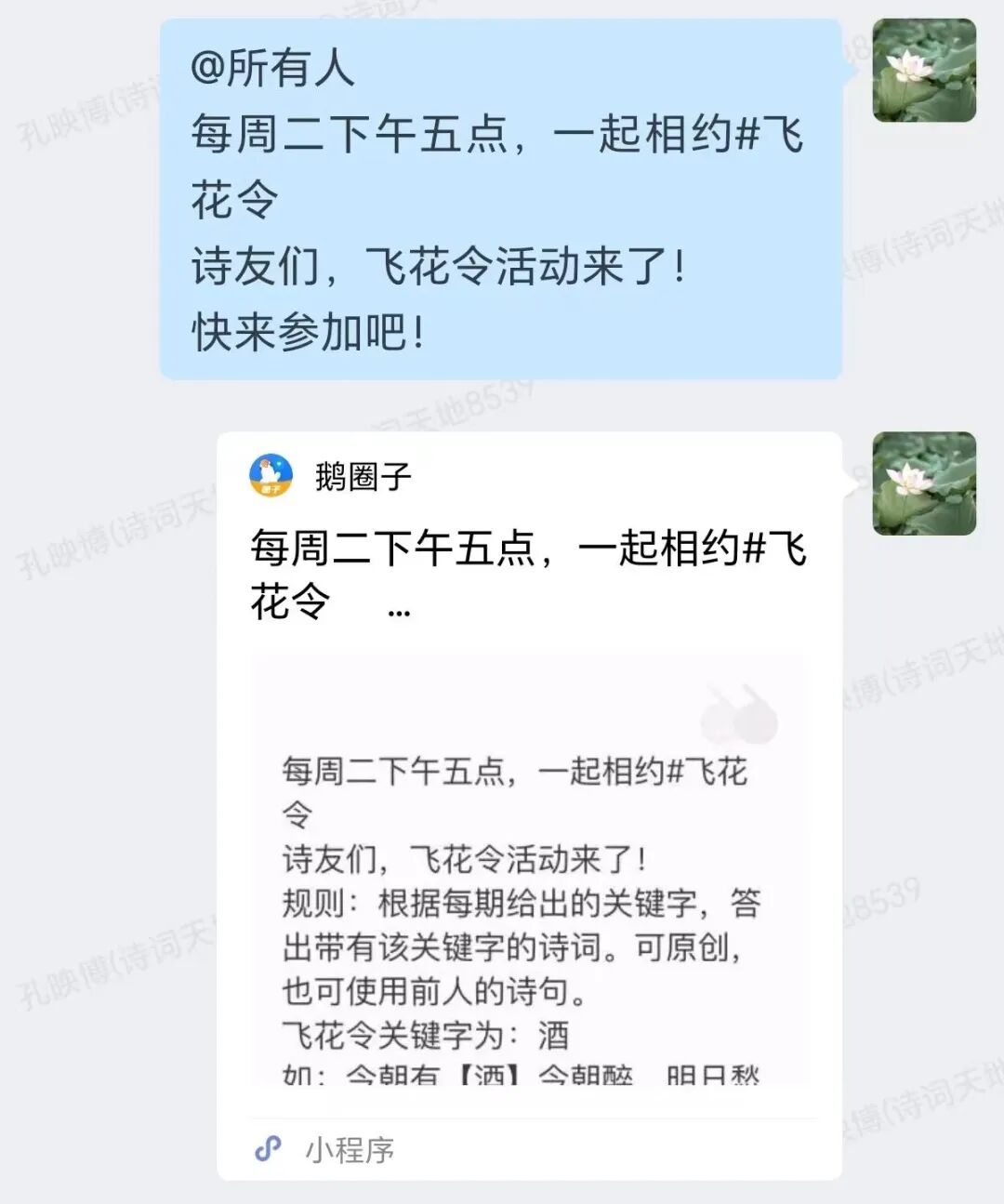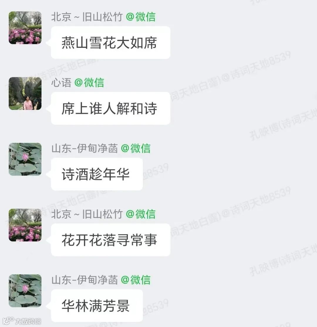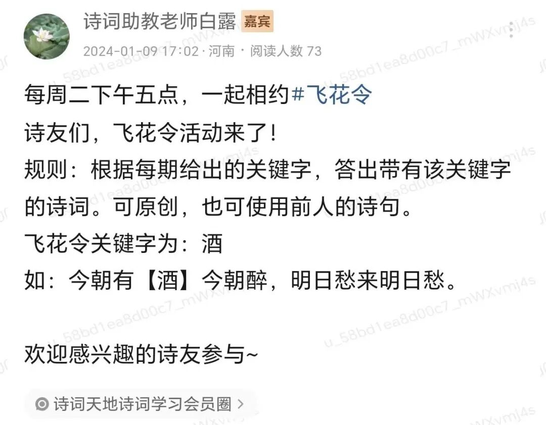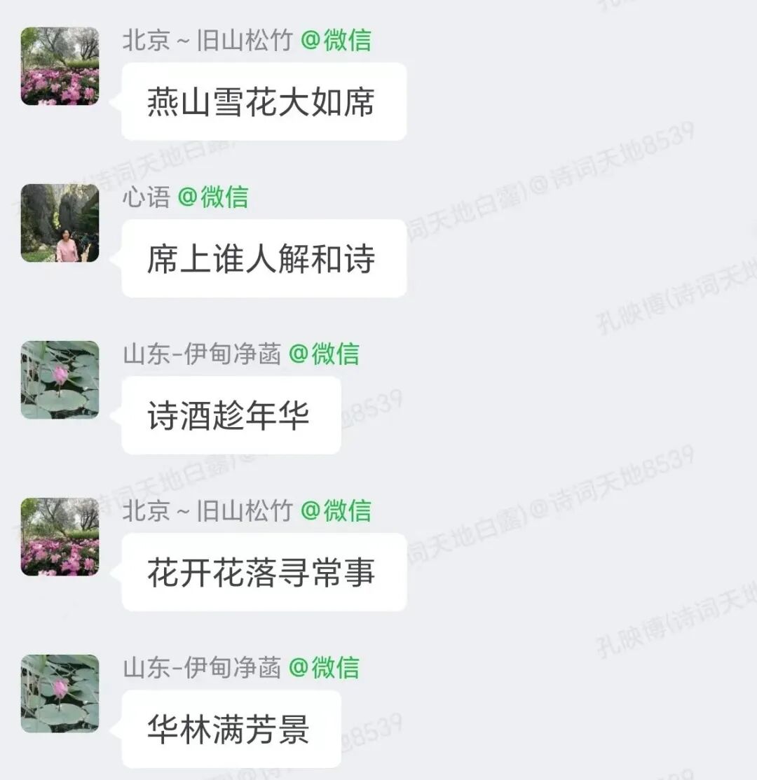 “诗词飞花令”,“诗词接龙”活动是诗词天地会员群内特有的活动,分别于周二,周四在会员诗友圈内举行。
