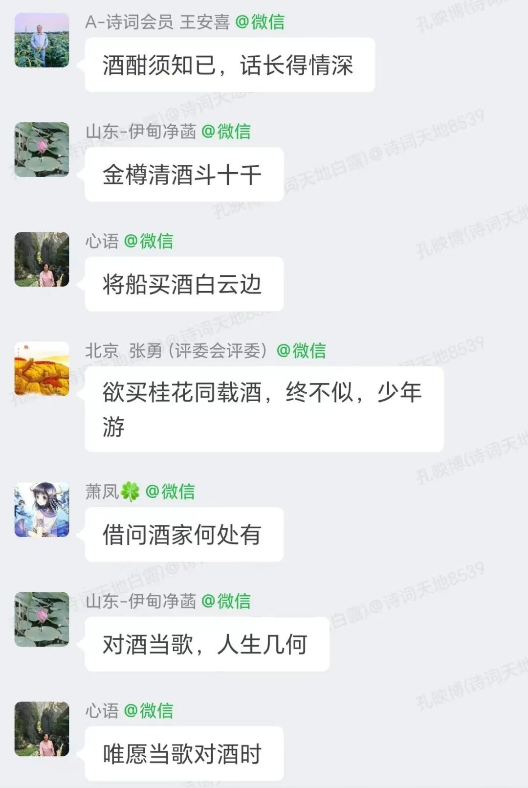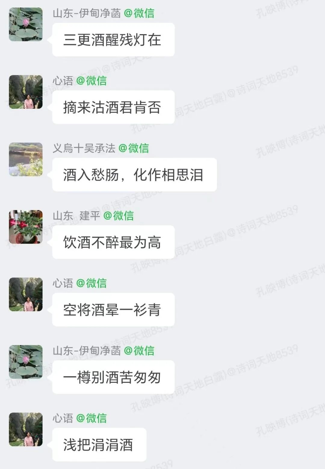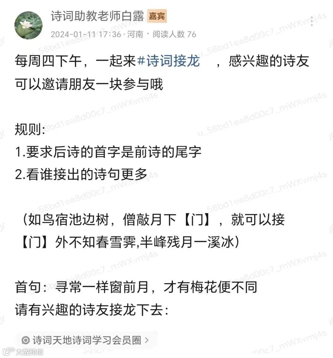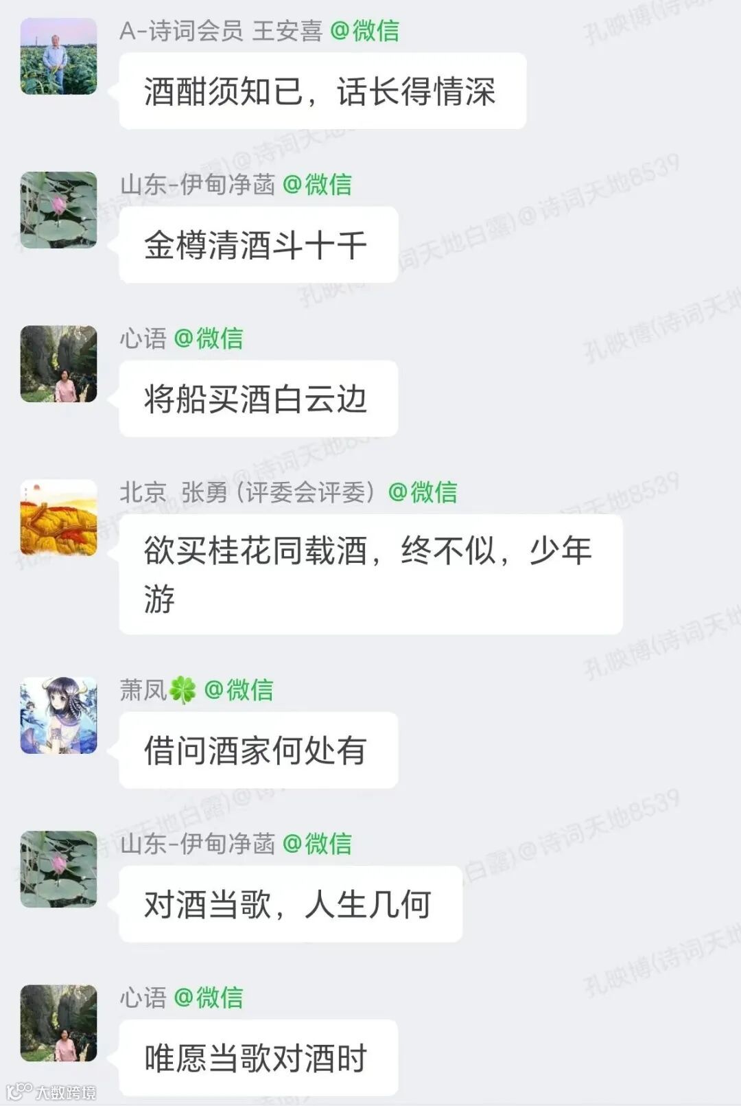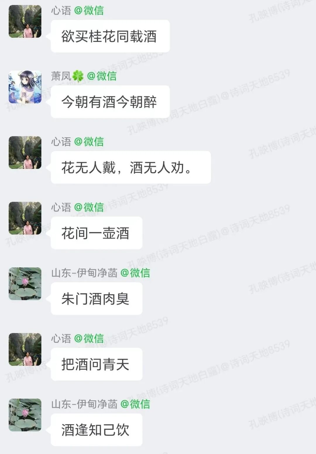 “诗词飞花令”,“诗词接龙”活动是诗词天地会员群内特有的活动,分别于周二,周四在会员诗友圈内举行。