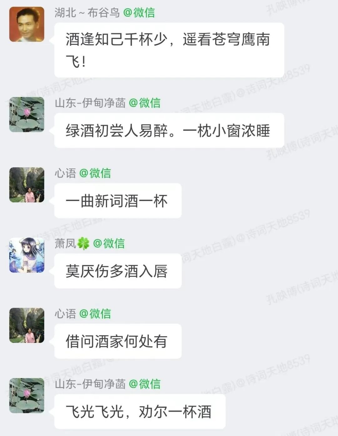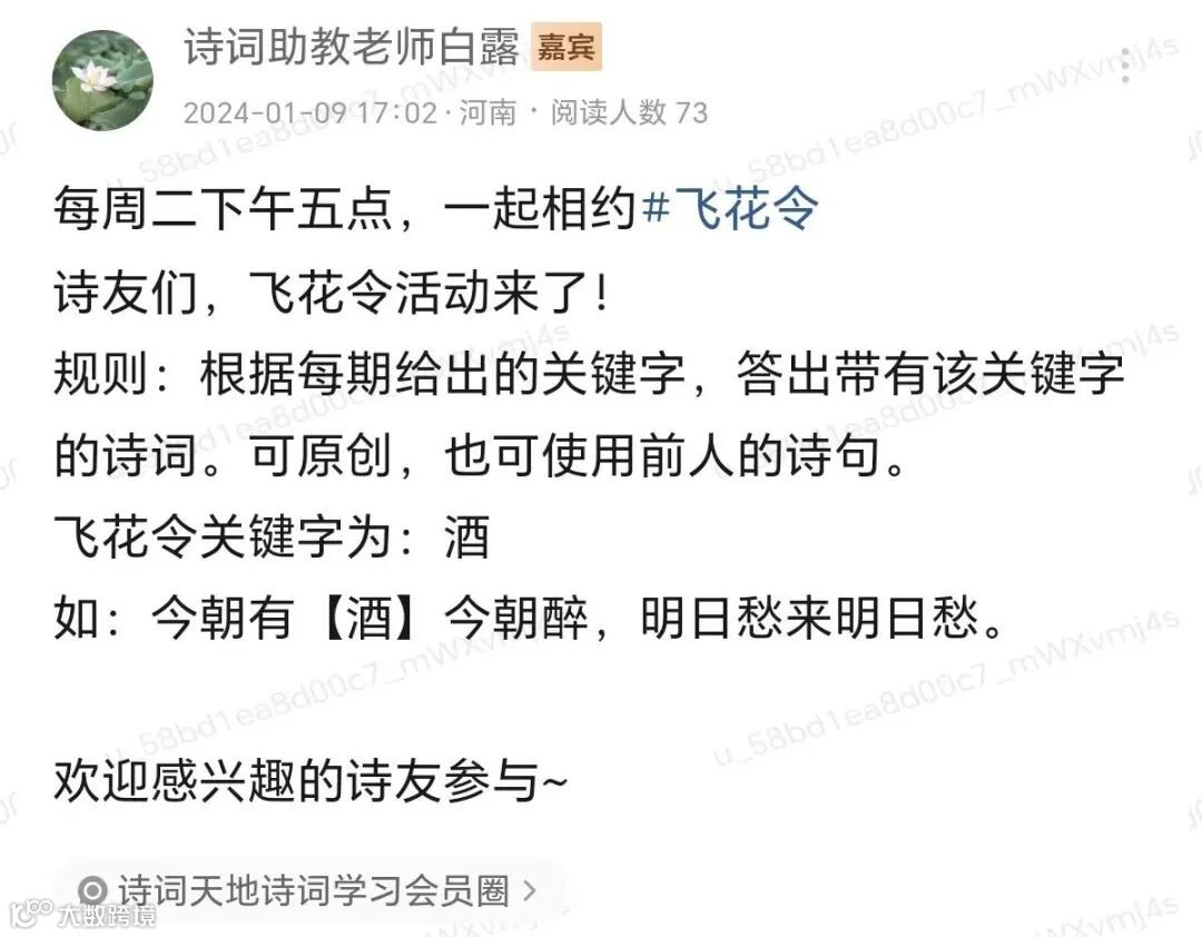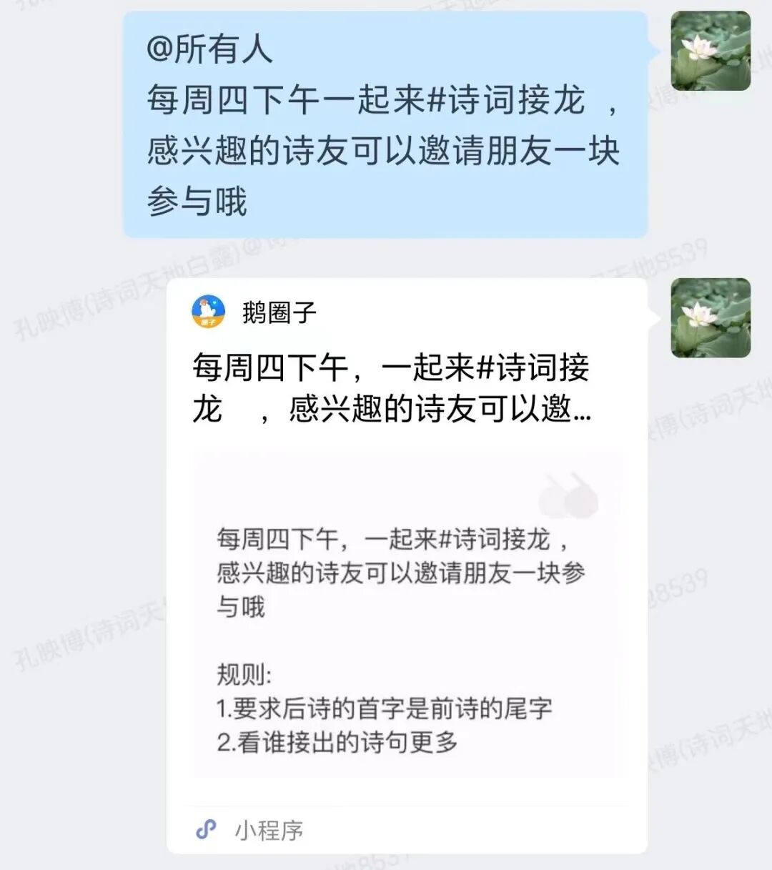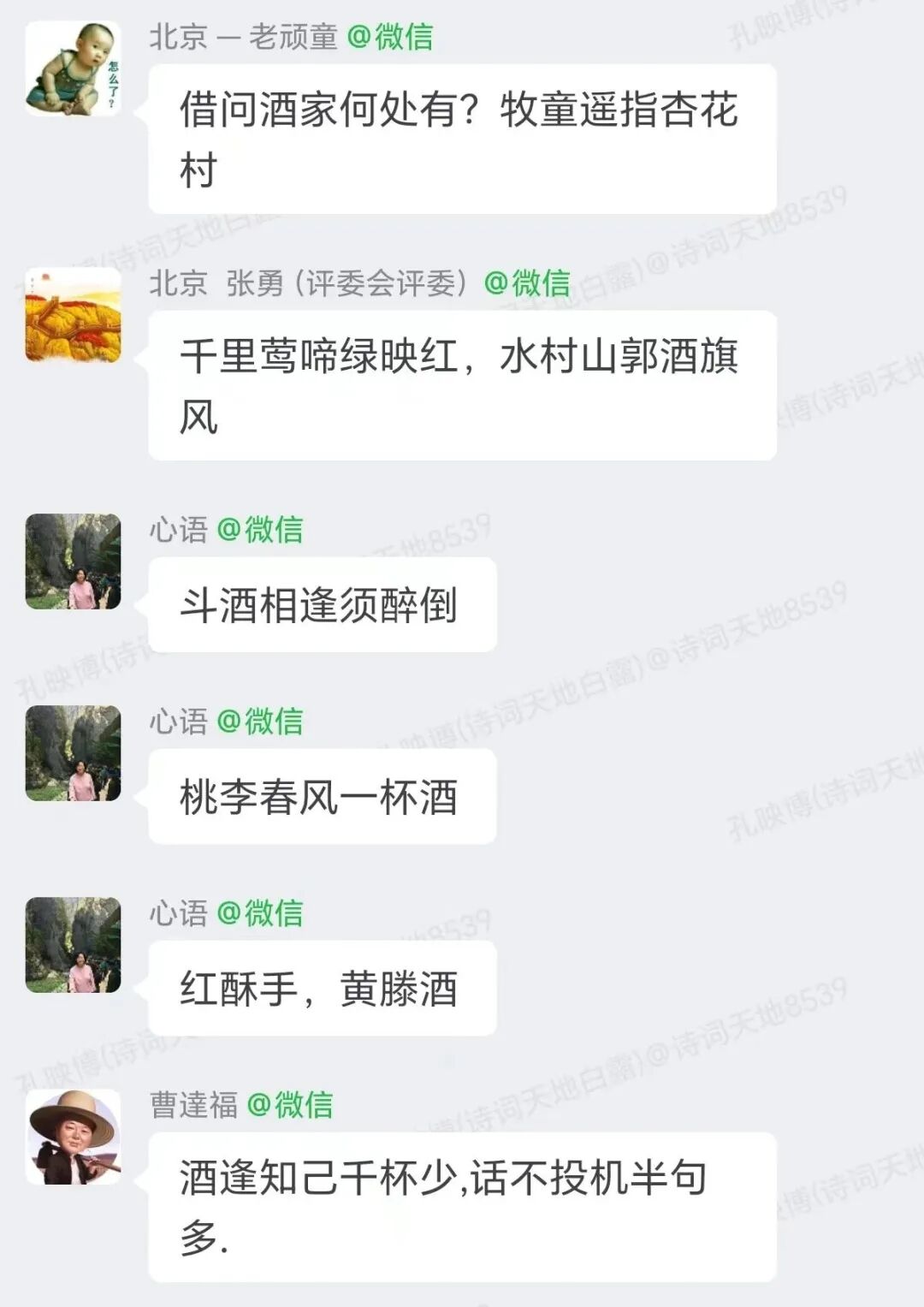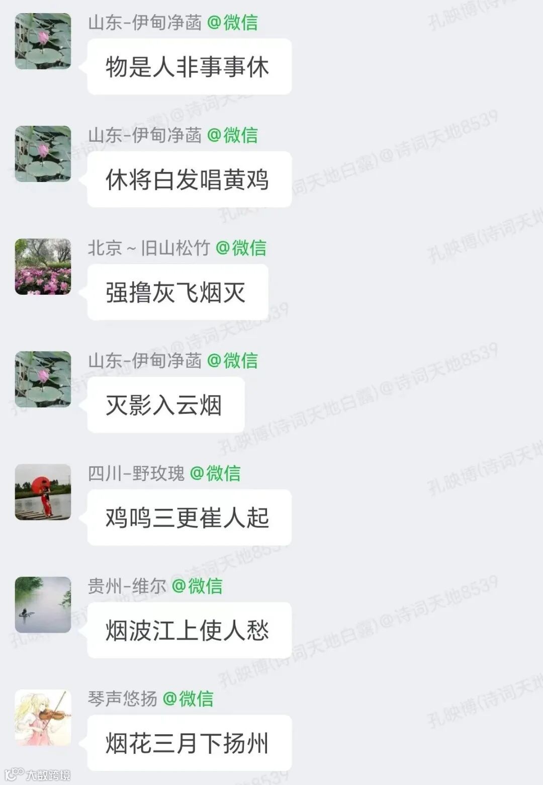 “诗词飞花令”,“诗词接龙”活动是诗词天地会员群内特有的活动,分别于周二,周四在会员诗友圈内举行。