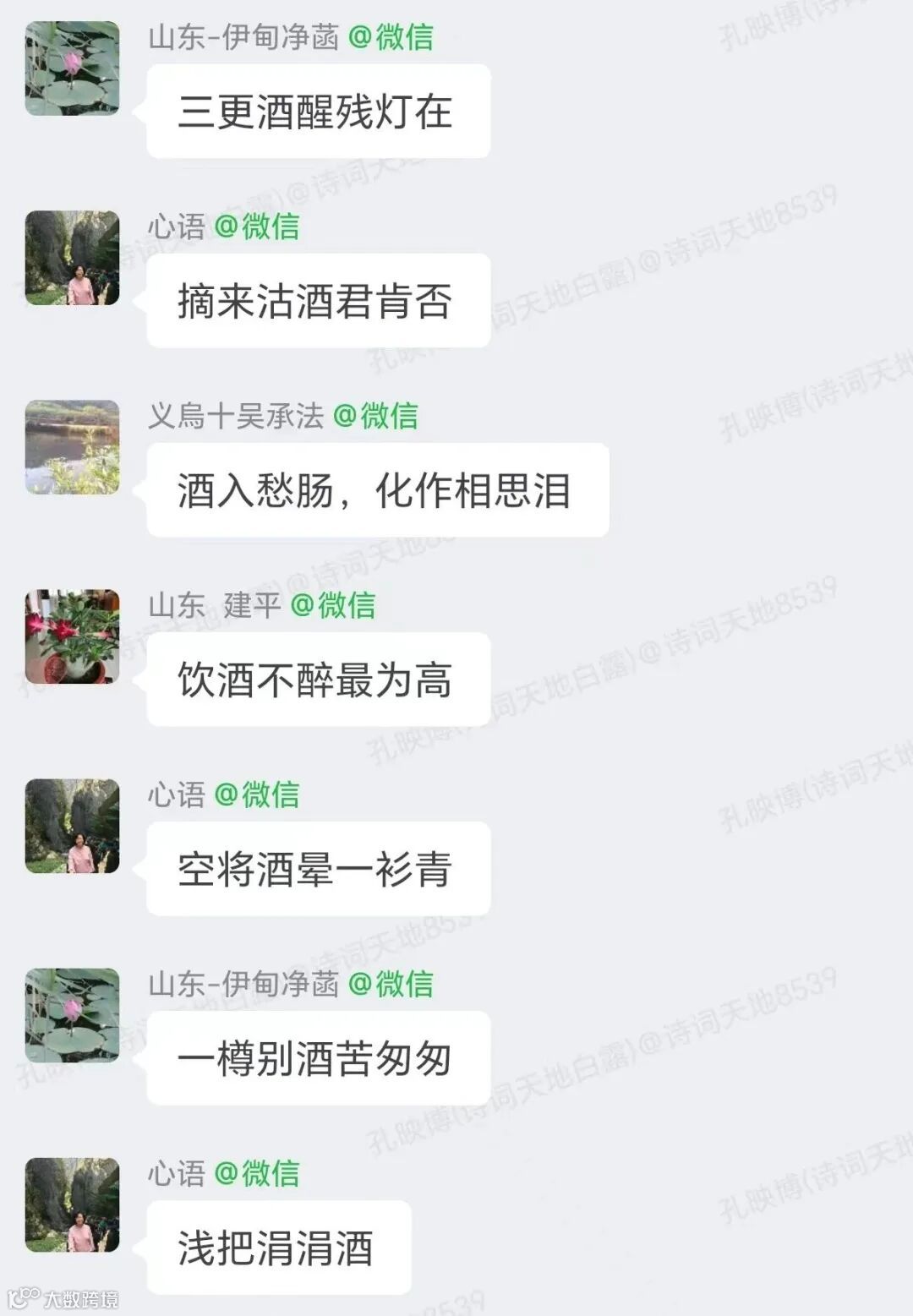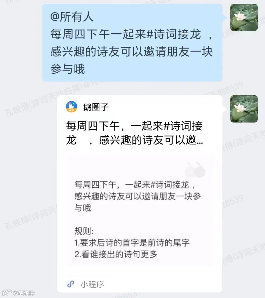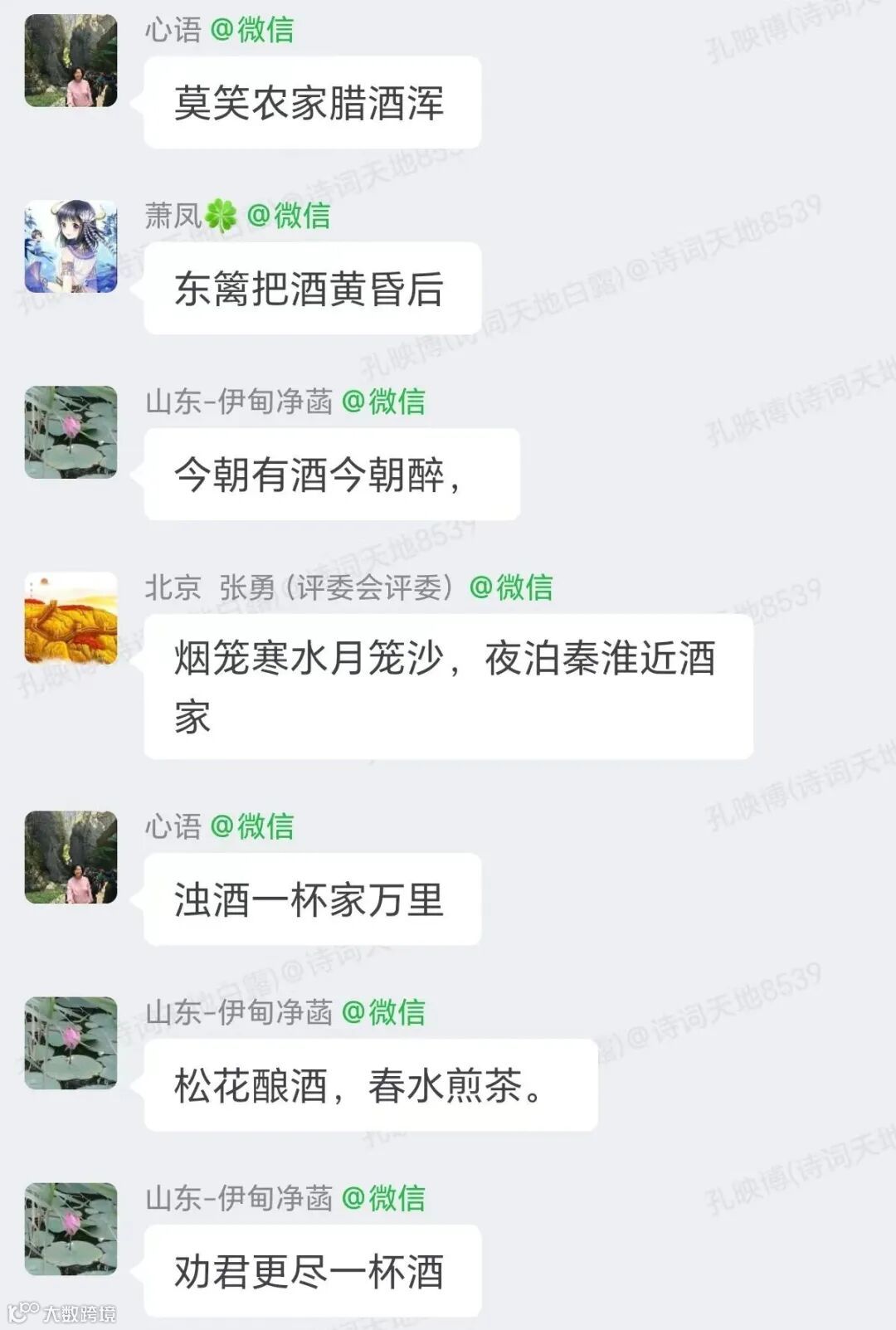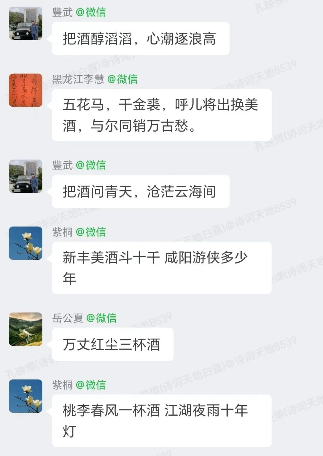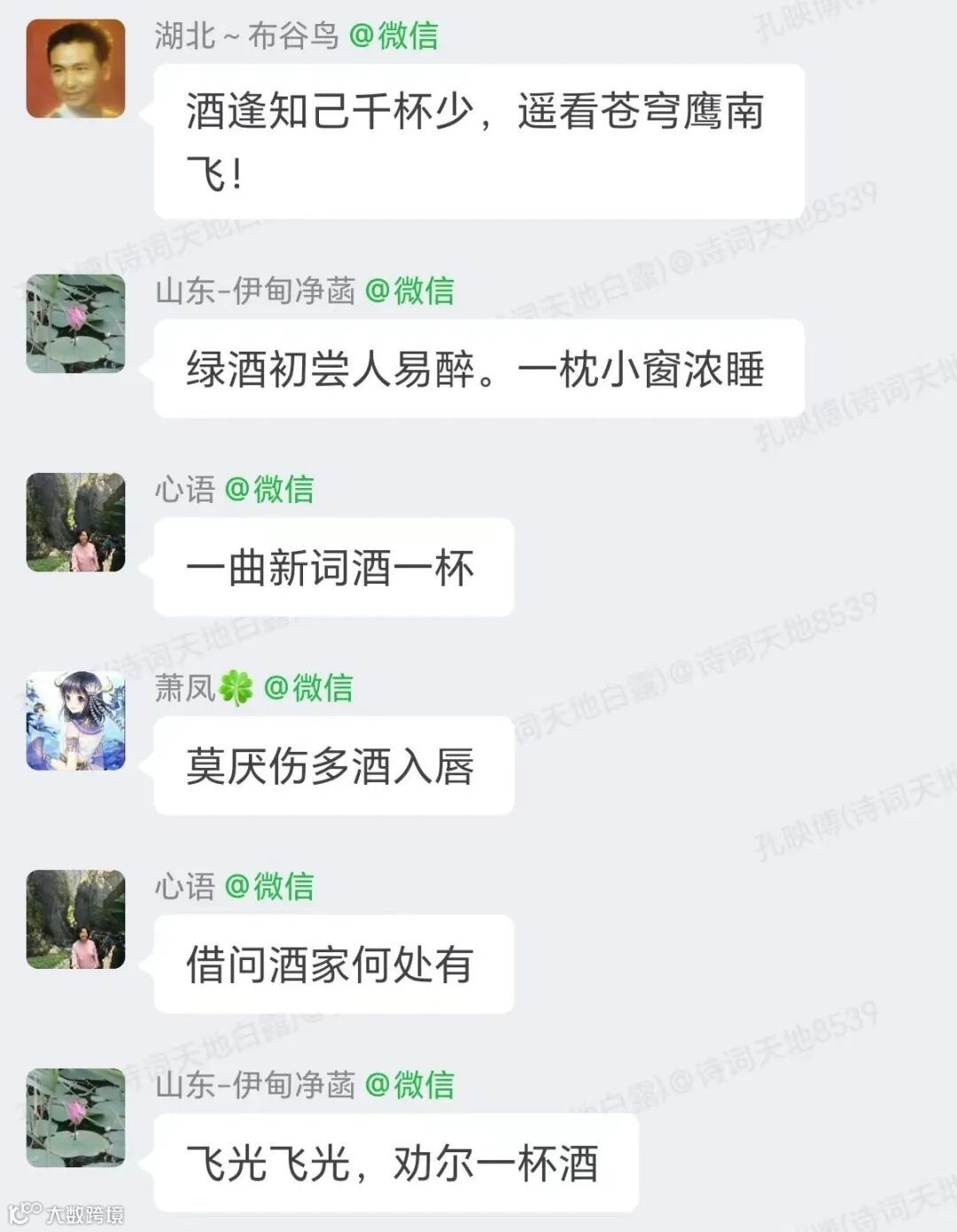 “诗词飞花令”,“诗词接龙”活动是诗词天地会员群内特有的活动,分别于周二,周四在会员诗友圈内举行。