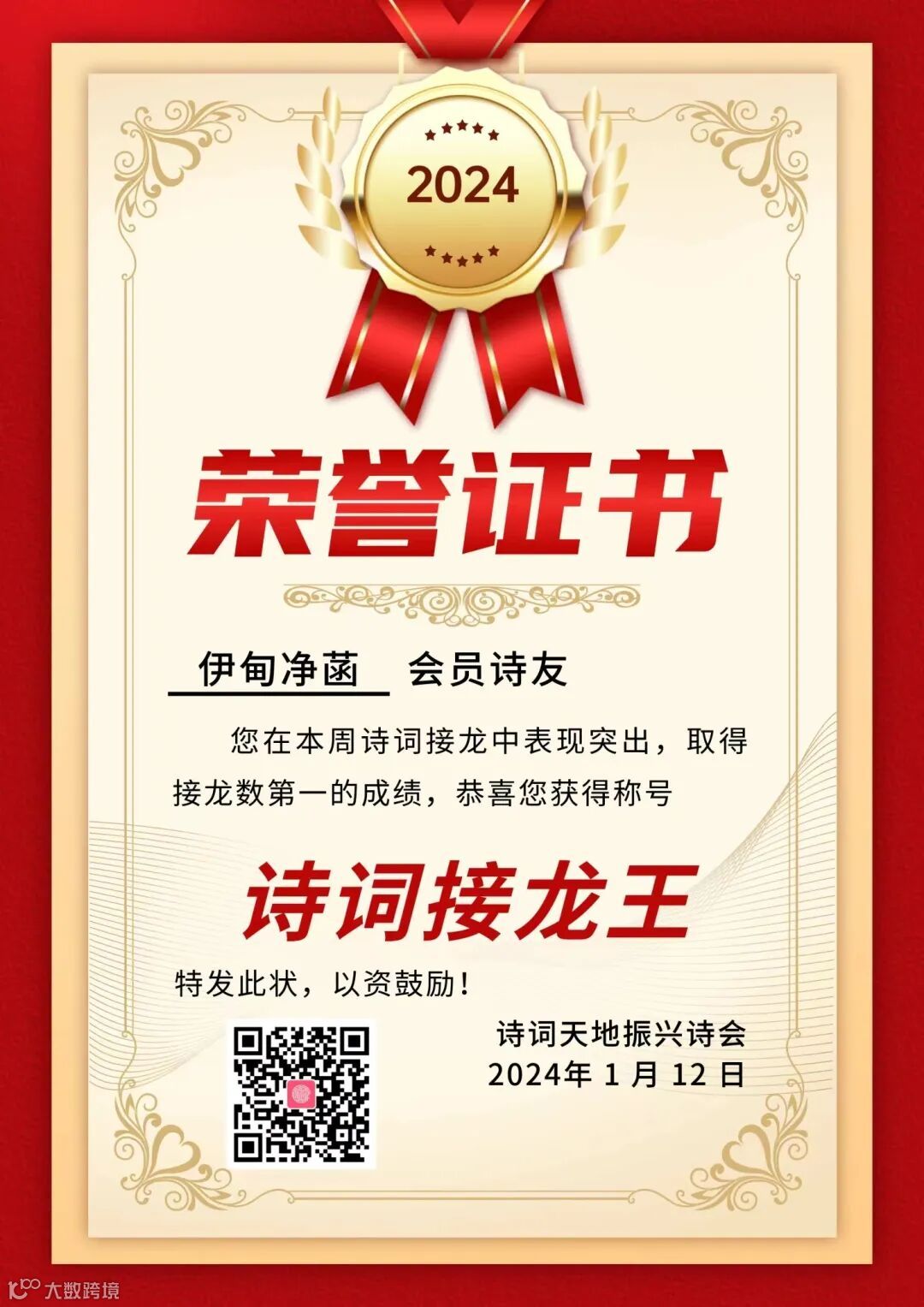 您在本周诗词接龙中表现突出,取得接龙数第一的成绩,荣获“诗词接龙王”的称号。(评选规则:会员诗友群内诗词接龙数量最多者)