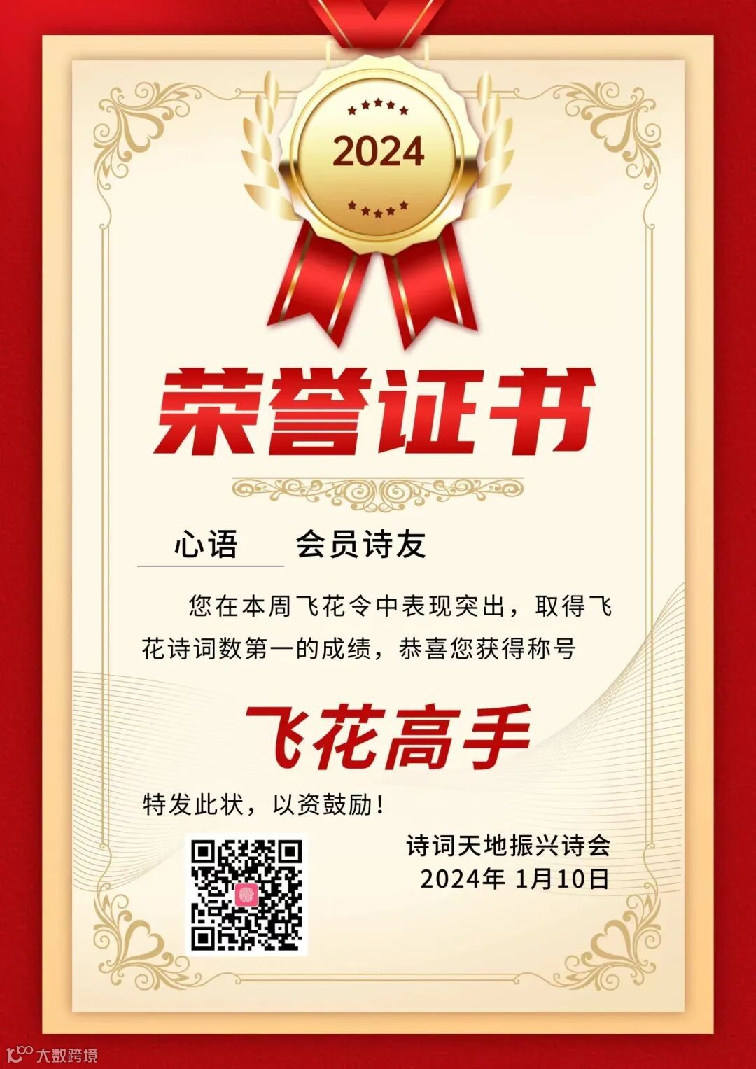 在本周“#飞花令 ”中表现突出,取得飞花诗词数第一的成绩,获得“飞花高手”称号。(评选规则:会员诗友群内飞花诗词数量最多者)