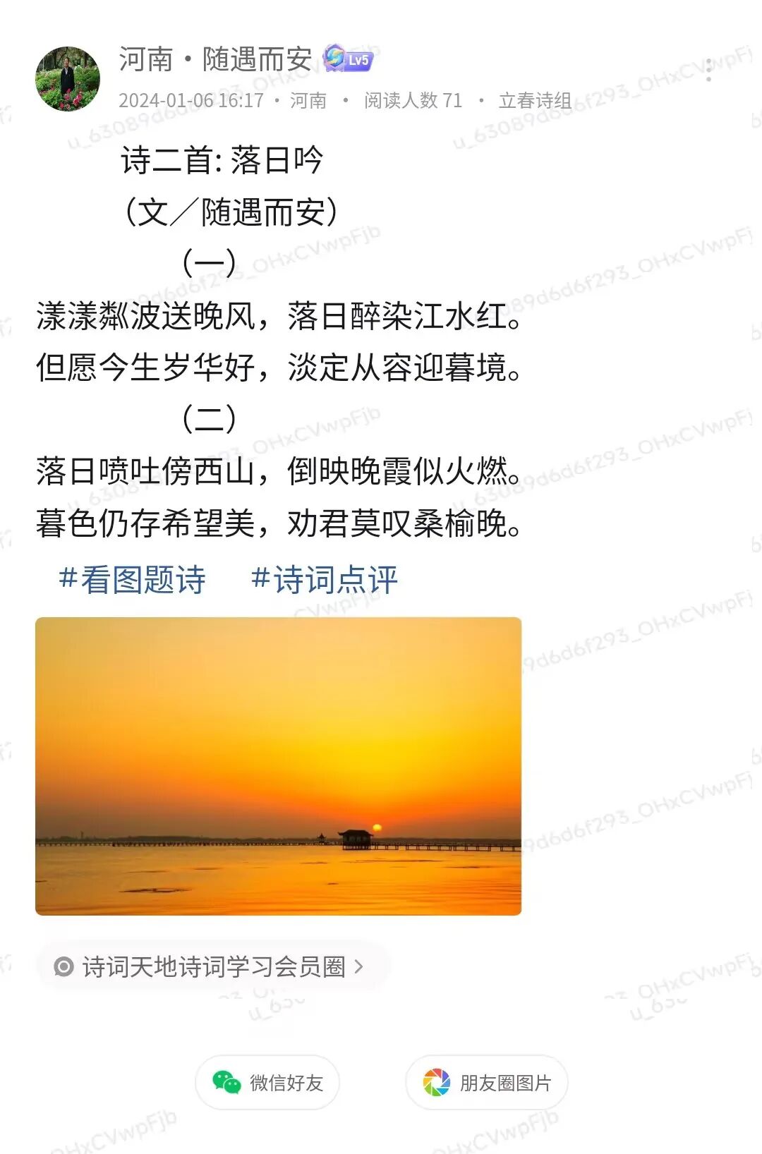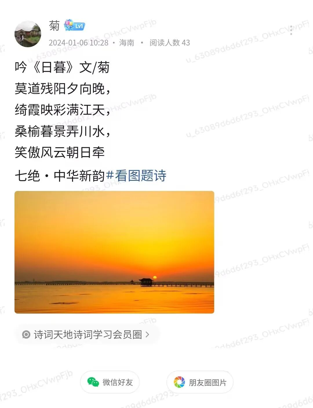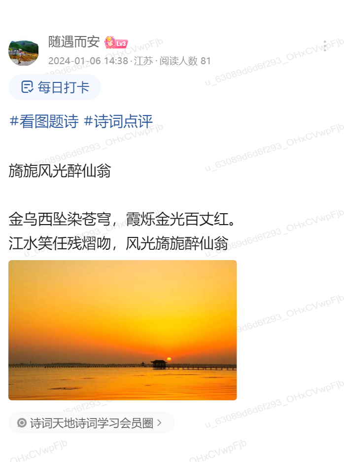 恭喜江苏的随遇而安会员诗友,在上周五看图题诗取得点赞数第一的成绩,获得称号“题诗神手”。