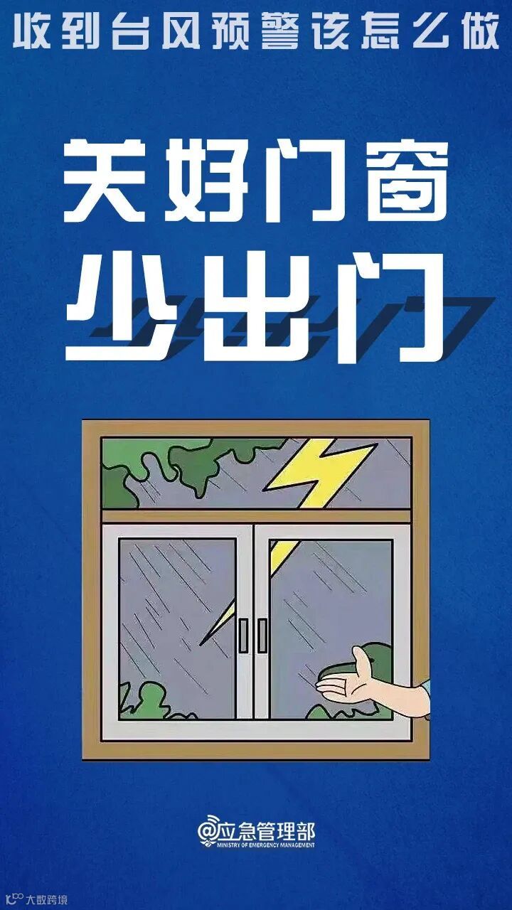 密切关注气象部门发布的台风及汛期动态信息,了解台风及汛期的强度和路径,非必要时尽量不要出门。