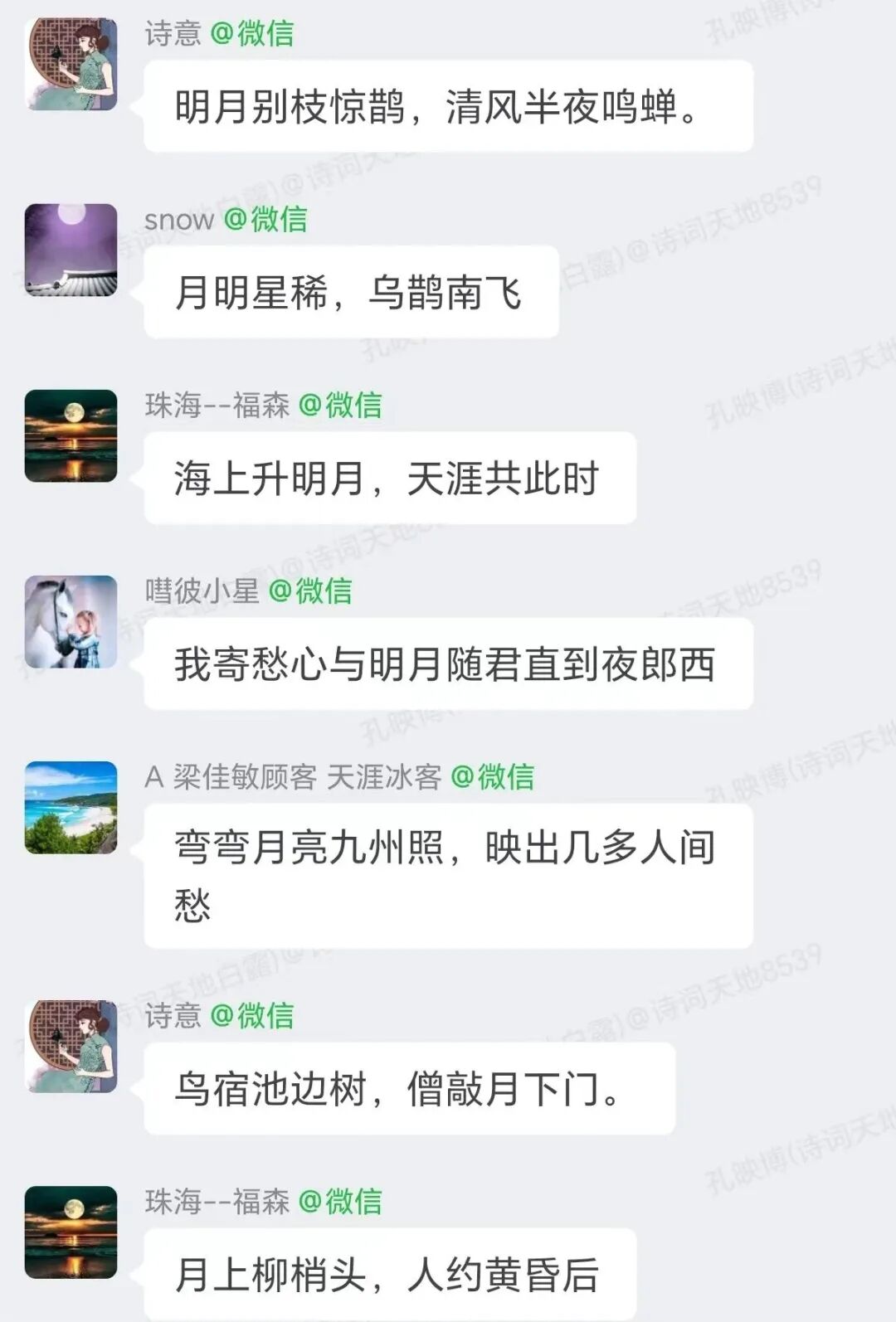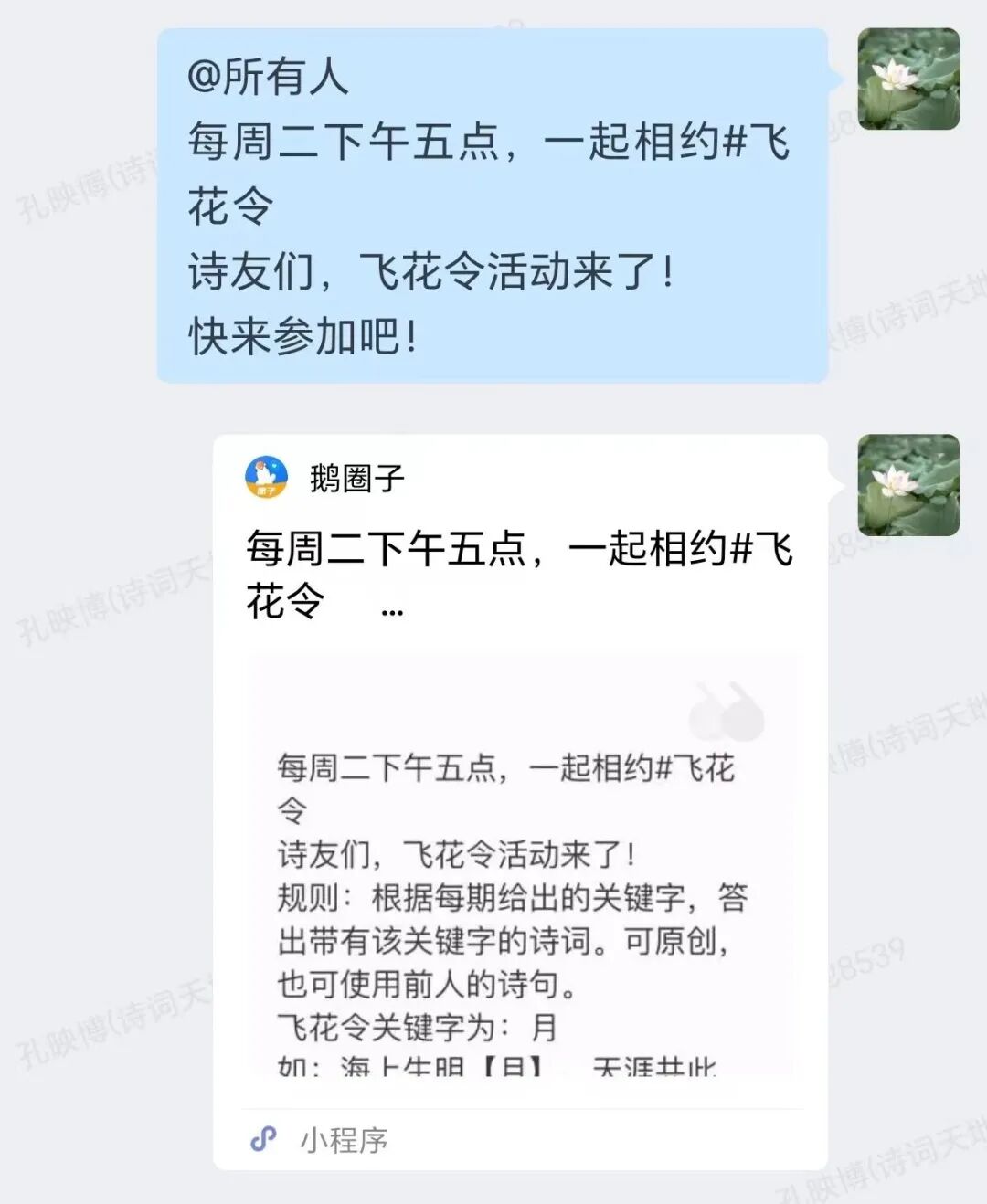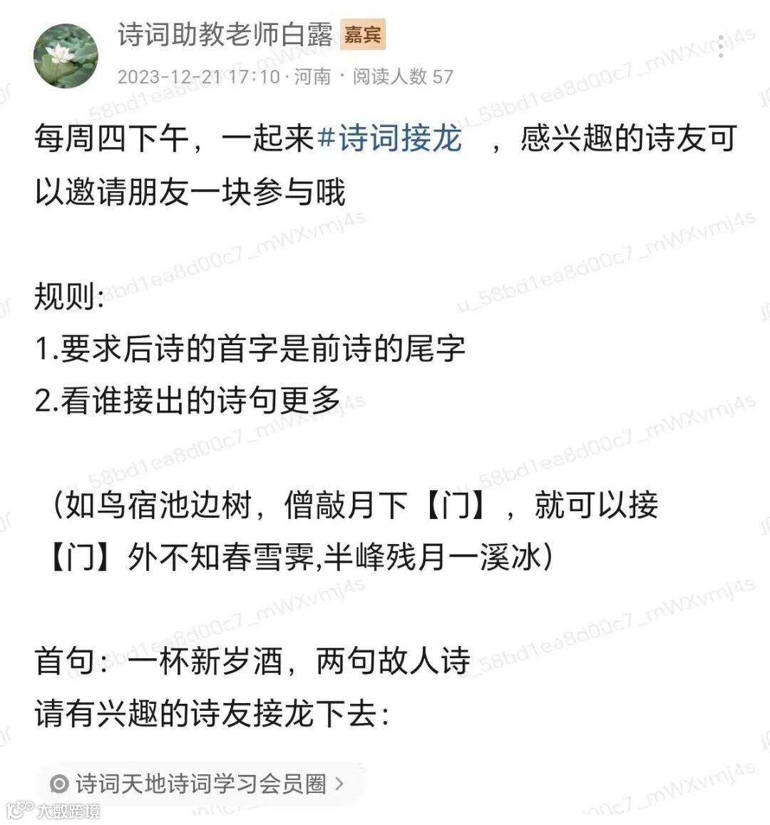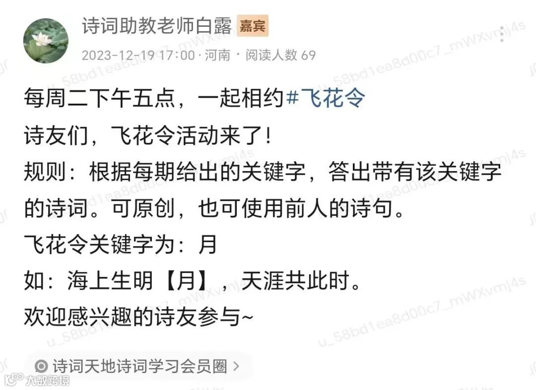 “诗词飞花令”,“诗词接龙”活动是诗词天地会员群内特有的活动,分别于周二,周四在会员诗友圈内举行。