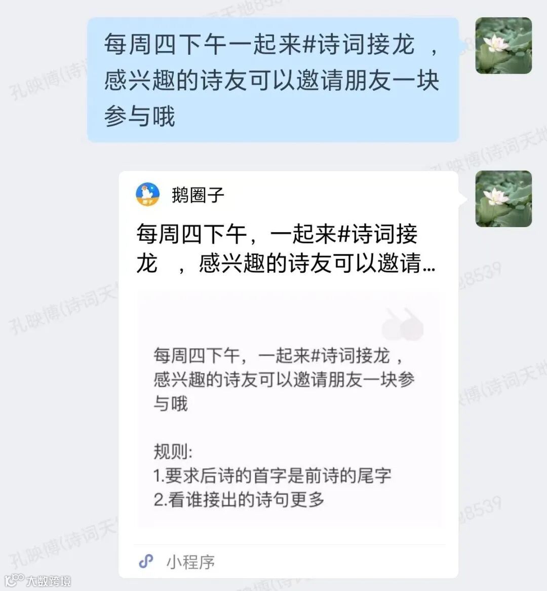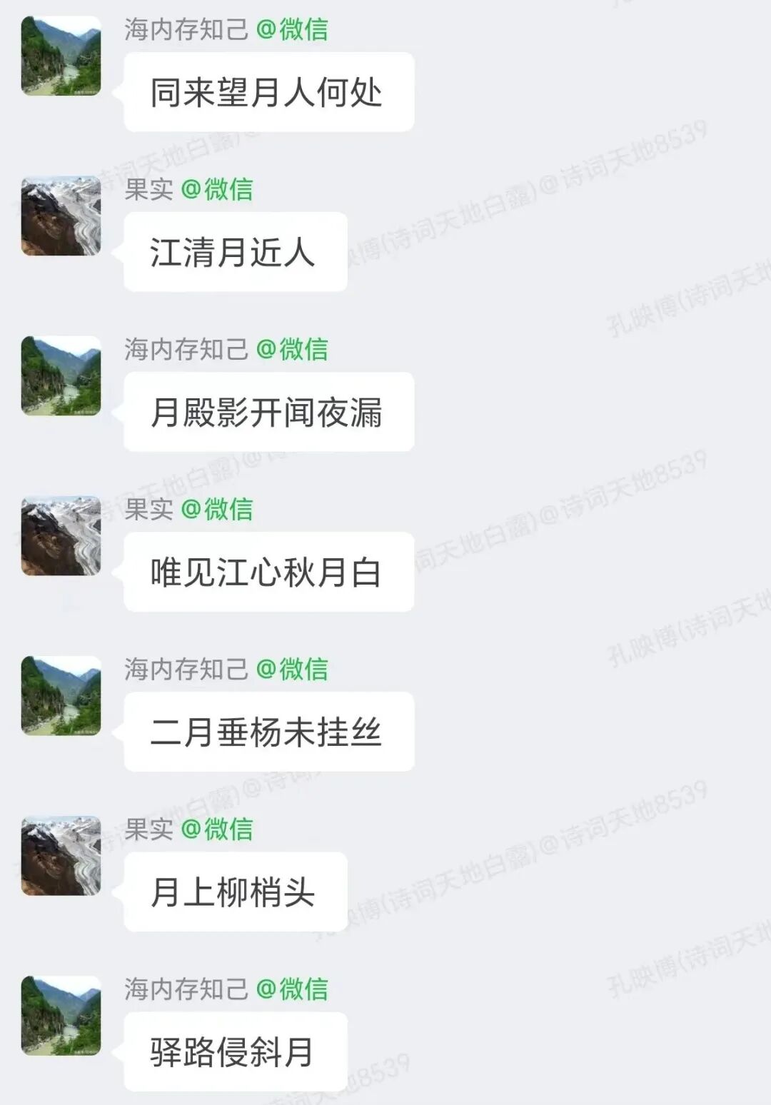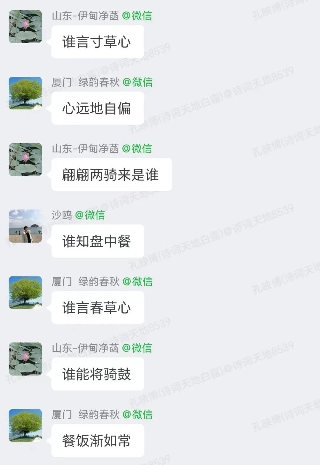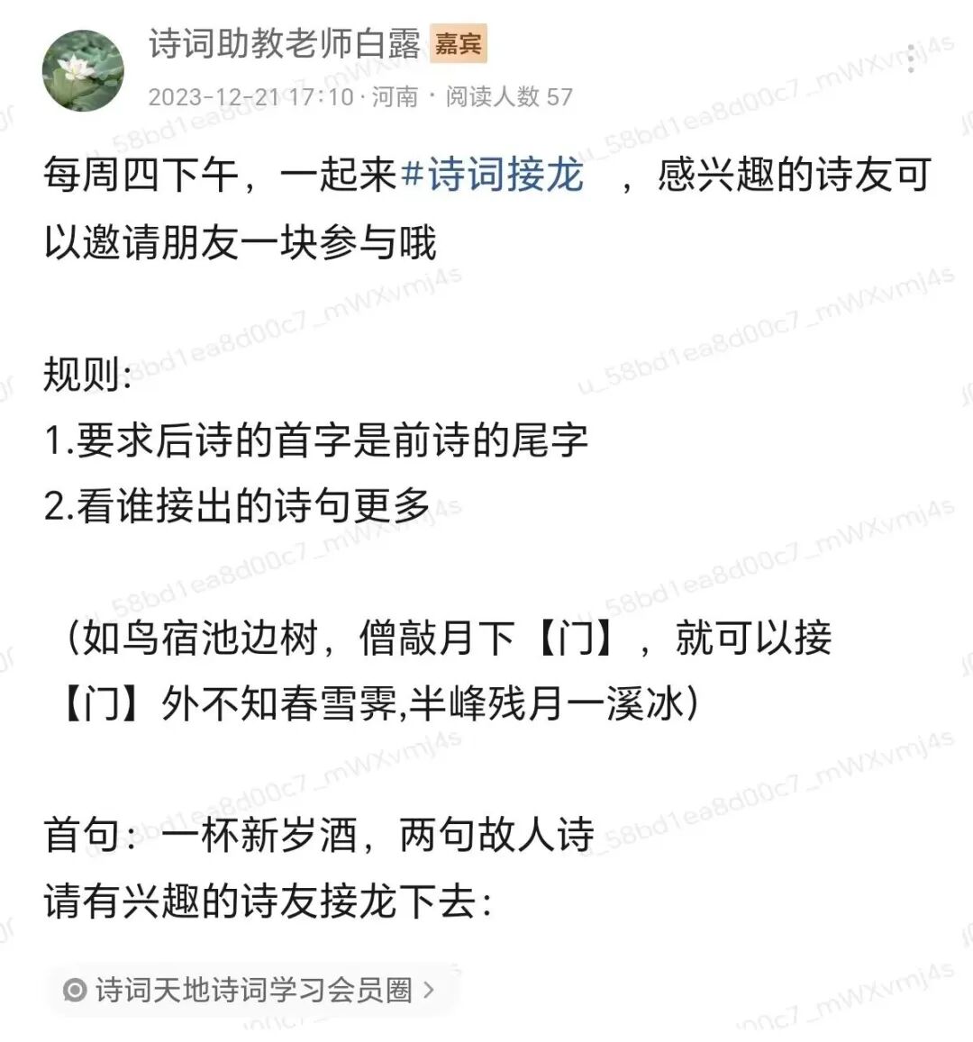 “诗词飞花令”,“诗词接龙”活动是诗词天地会员群内特有的活动,分别于周二,周四在会员诗友圈内举行。