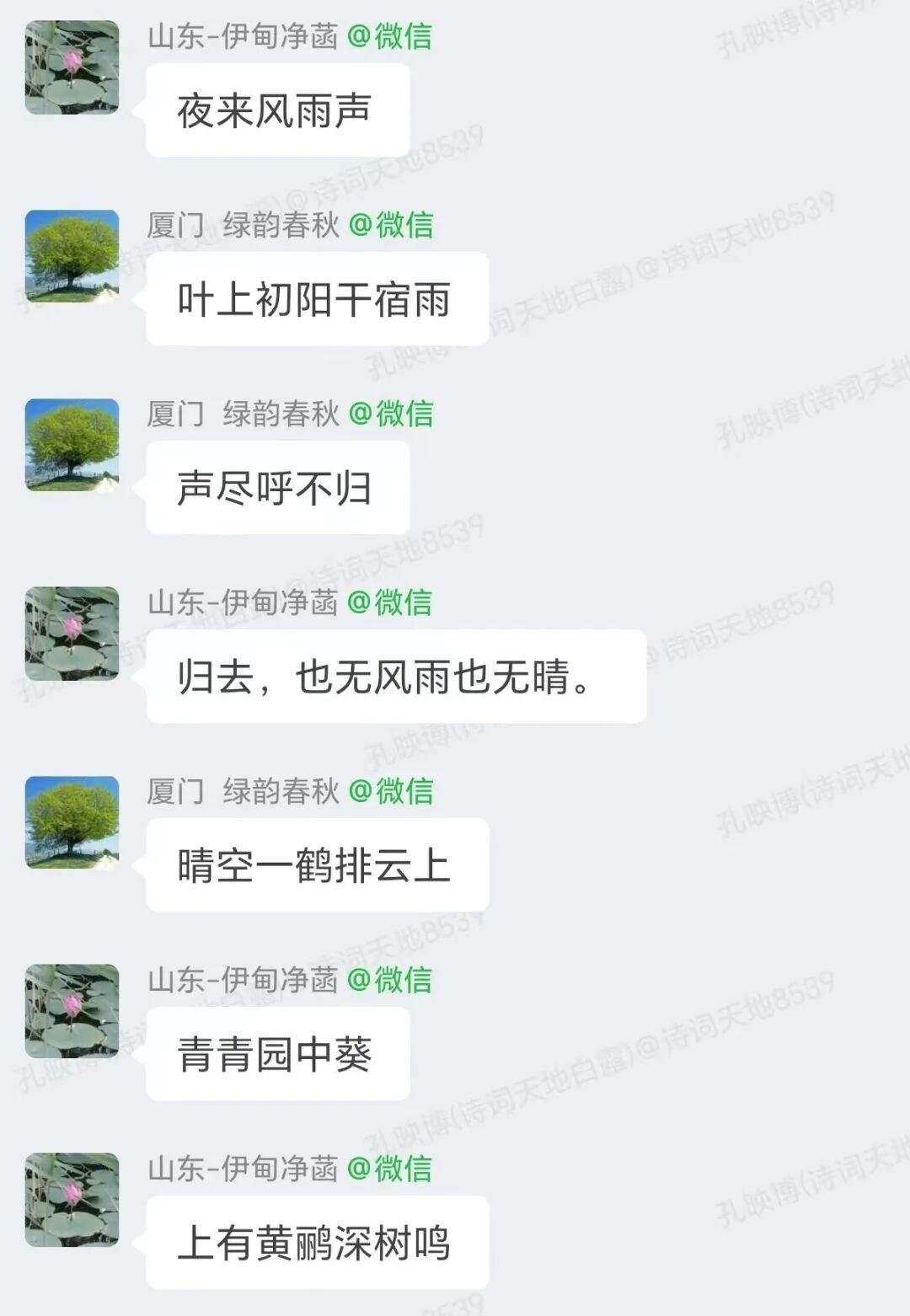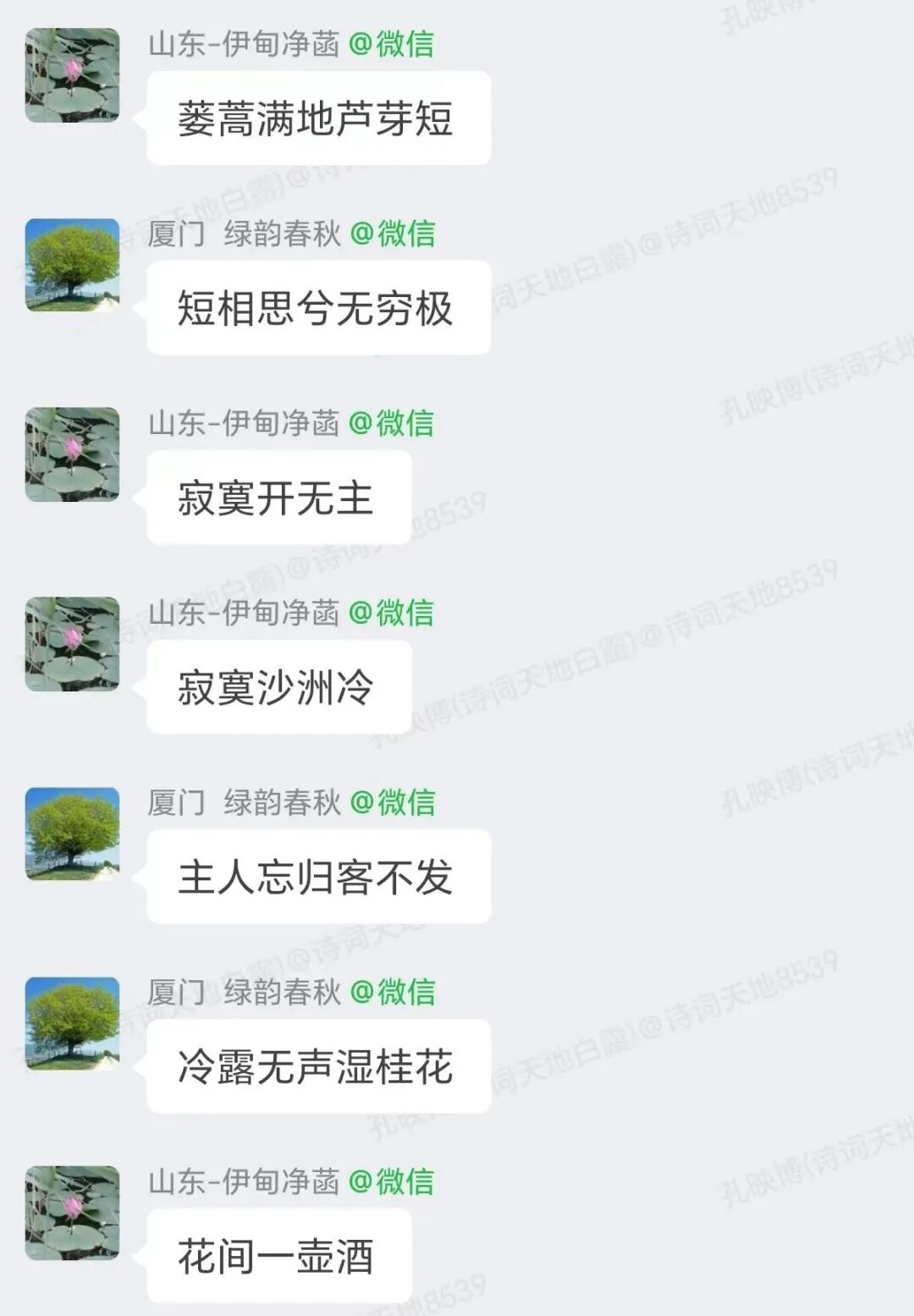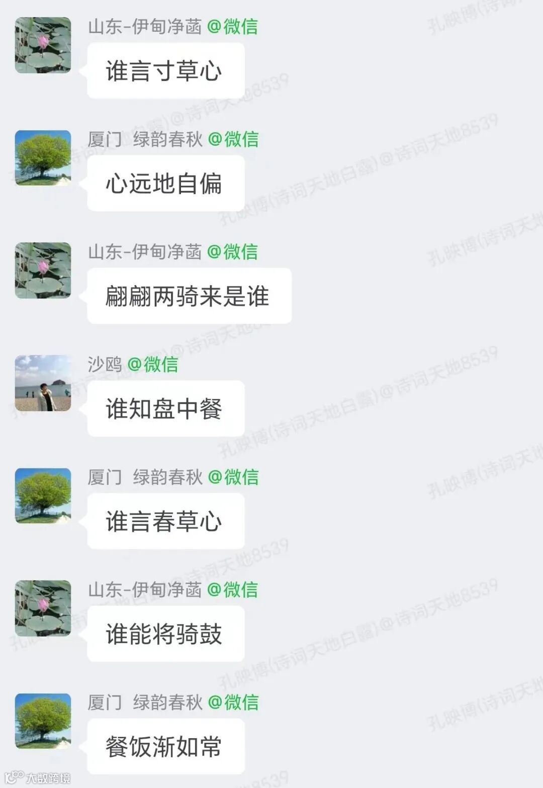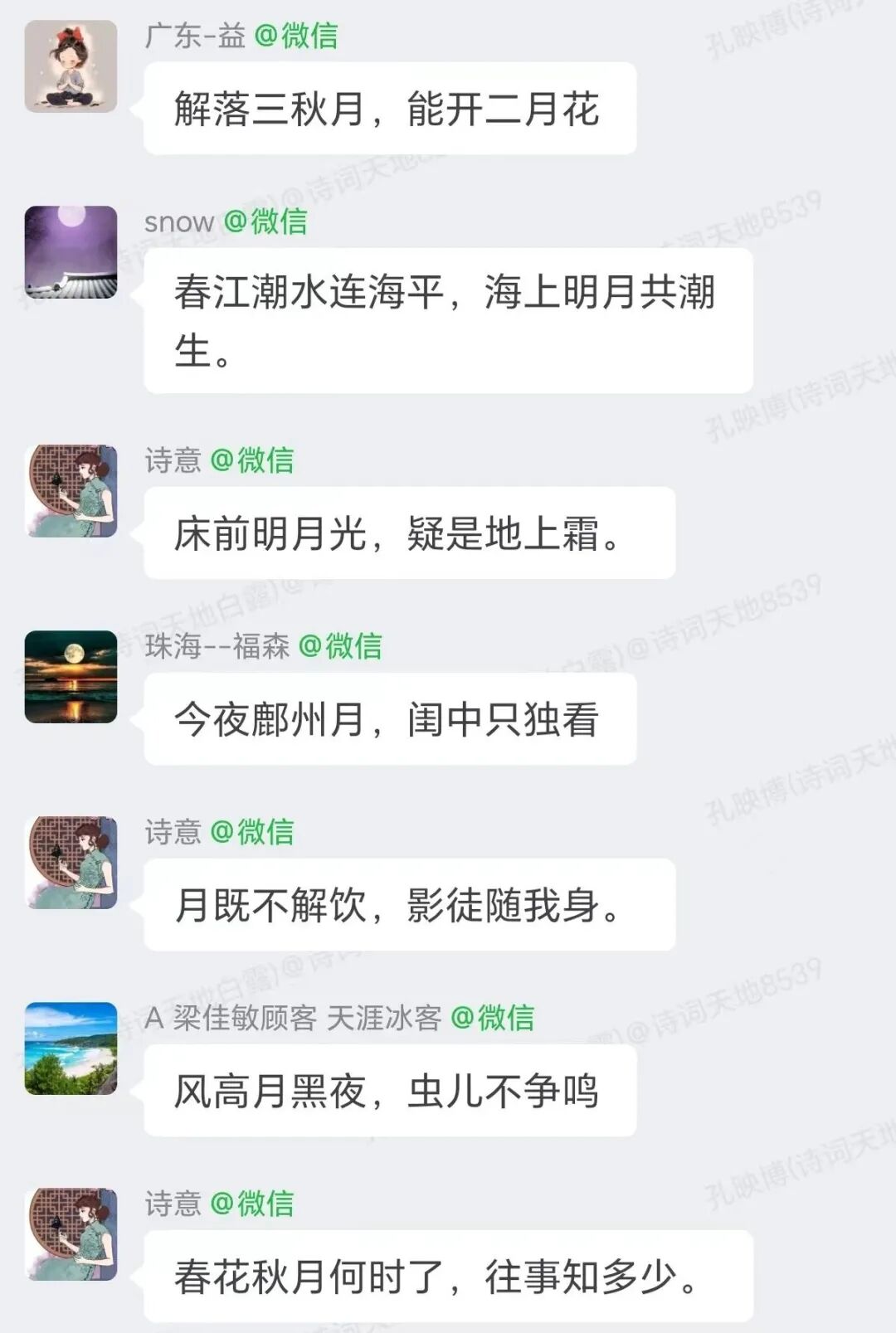 “诗词飞花令”,“诗词接龙”活动是诗词天地会员群内特有的活动,分别于周二,周四在会员诗友圈内举行。