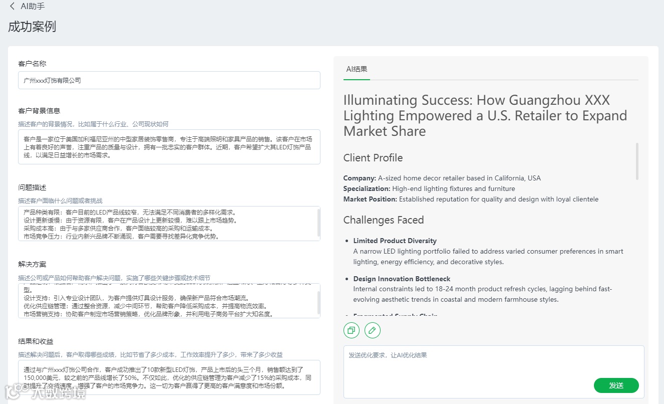 通过Ueeshop AI助手,卖家只需要输入客户信息和合作成果,即可快速获得一份高质量的成功案例。同时,如果卖家案例数量有限,也可以借助AI工具,来创造并完善案例细节,从而提高案例的真实性和可靠性。