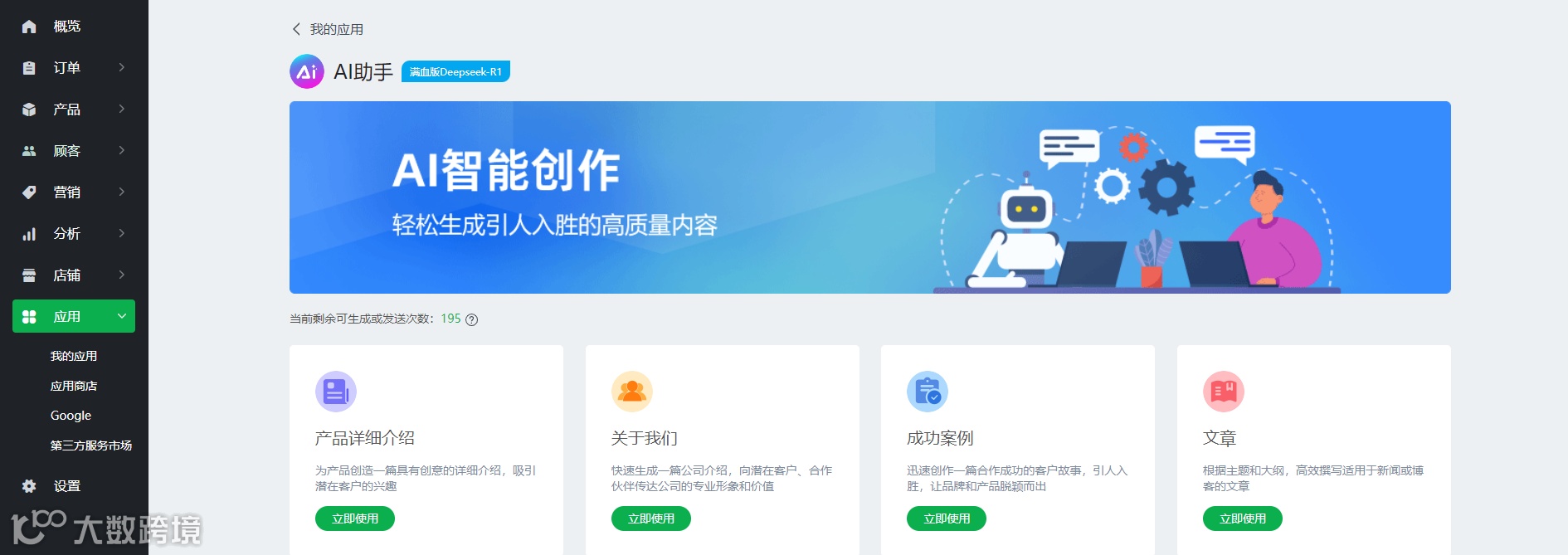 Ueeshop与Deepseek R1模型的结合,为跨境卖家提供了一种全新的、高效的内容创作方式,卖家既无需花费大量的时间在内容创作上,也无需自行训练模型,只需要给出具体需求,AI助手就能帮助卖家在短时间内创作出高质量的内容。这是能够帮助卖家在提升运营效果的基础上,提高工作效率的。