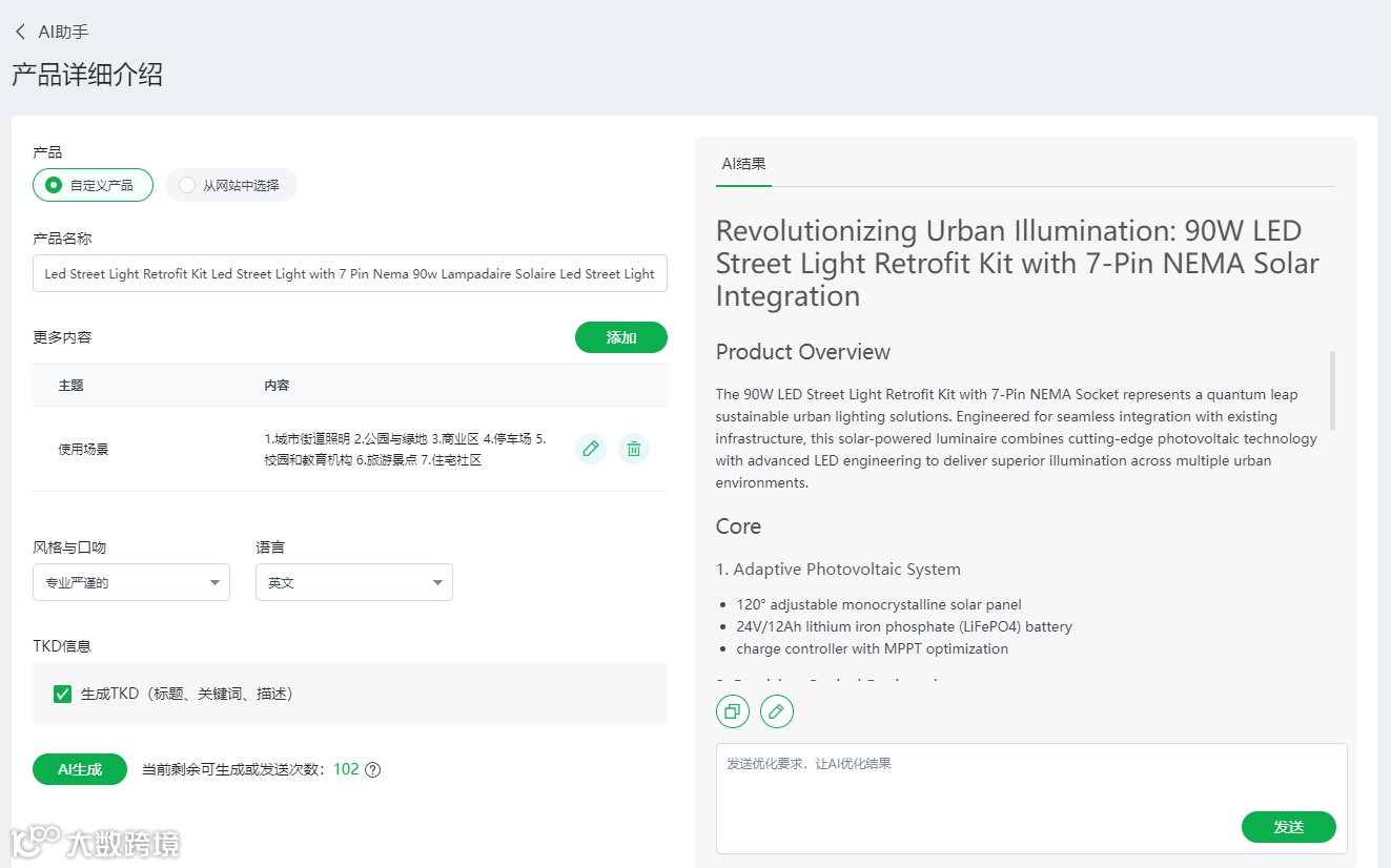 产品详细介绍:在跨境电商中,产品描述是吸引消费者购买的关键,优秀的产品介绍不仅要详细地展示产品特性,还要与潜在用户需求相契合,能够让消费者感受到产品的独特价值。传统的写作方式,常常需要花费大量时间去构思和编辑,且内容参差不齐。