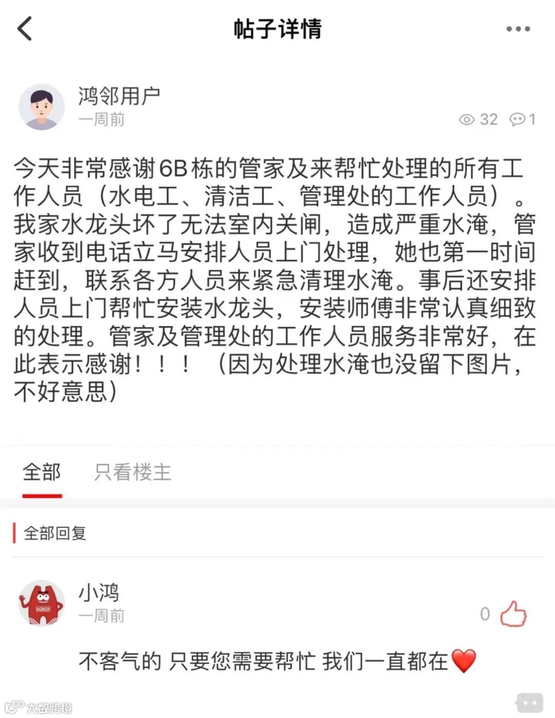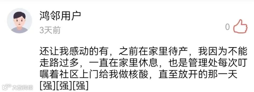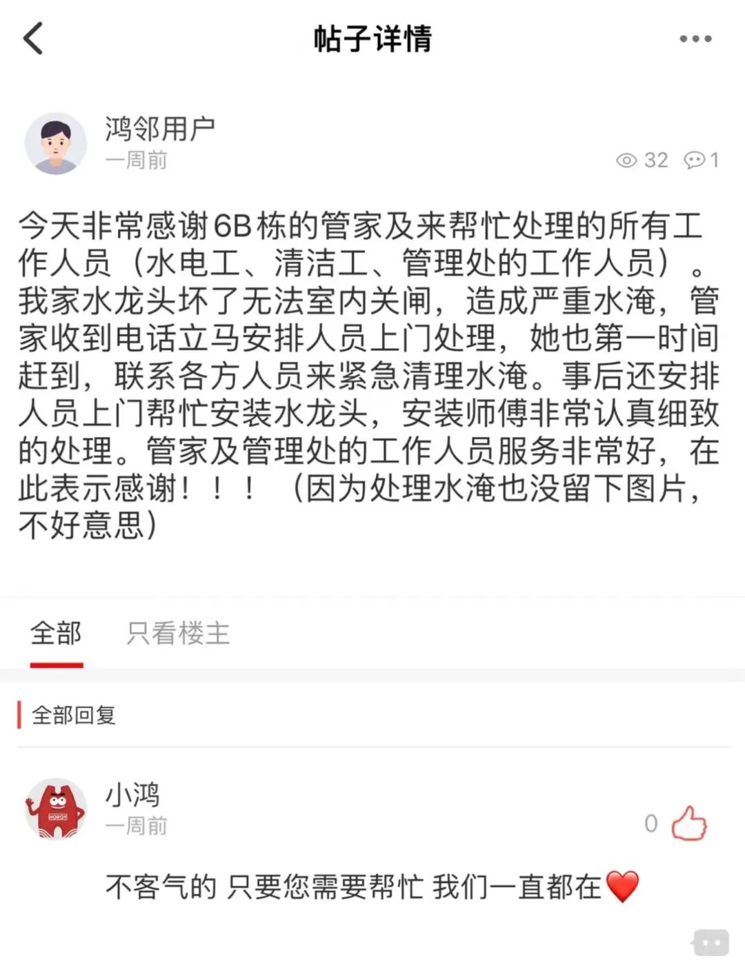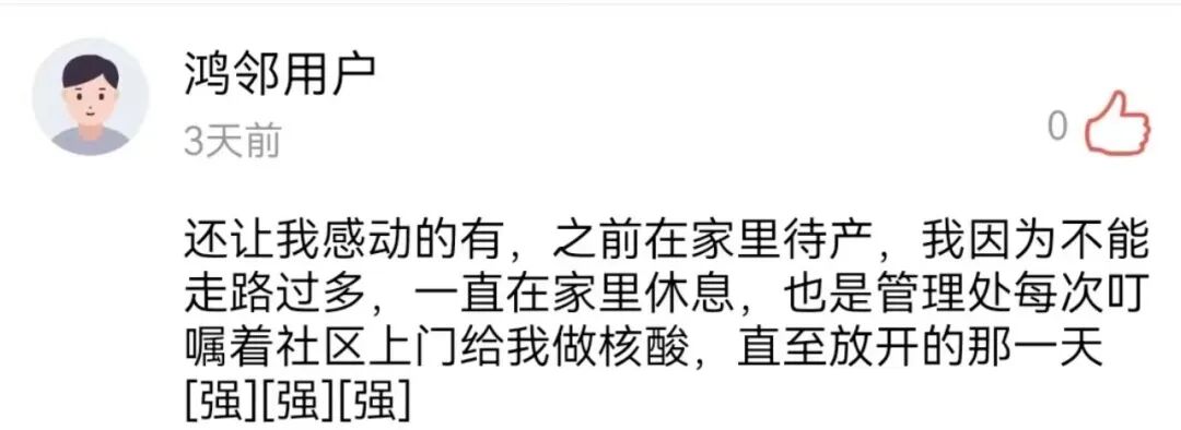 这位宝妈业主欣喜的在鸿邻社区晒出这份心意,还称感动不止这一次。从待产期开始,物业服务中心便一直为她主动提供服务,为照顾不宜过多走动的她,物业每次都会特别叮嘱社区上门为她进行核酸检测。