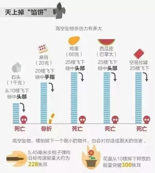 一枚30克的蛋从4楼抛下,能让人起肿包;从8楼抛下,能让人头皮破损;从18楼抛下,能砸破行人的头骨;从25楼抛下,可使人当场致死。因此,更要特别注意预防高空抛下以下7种常见的生活物品。
