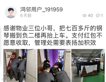 2022年1月23日,西城雅筑业主自发筹集慰问金14342.65元,为鸿荣源物业服务团队32位工作人员送上暖心慰问,这已是西城雅筑业主们连续八年来的惯例。“物业与业主,在同一个家园朝夕相处,已经不是单纯的合同关系,更是友邻、是朋友、是亲人,是家园的守护者。”业主陈先生说道。业主的认可,激励着我们不断提升服务标准,用时间与匠心去营造美好生活。