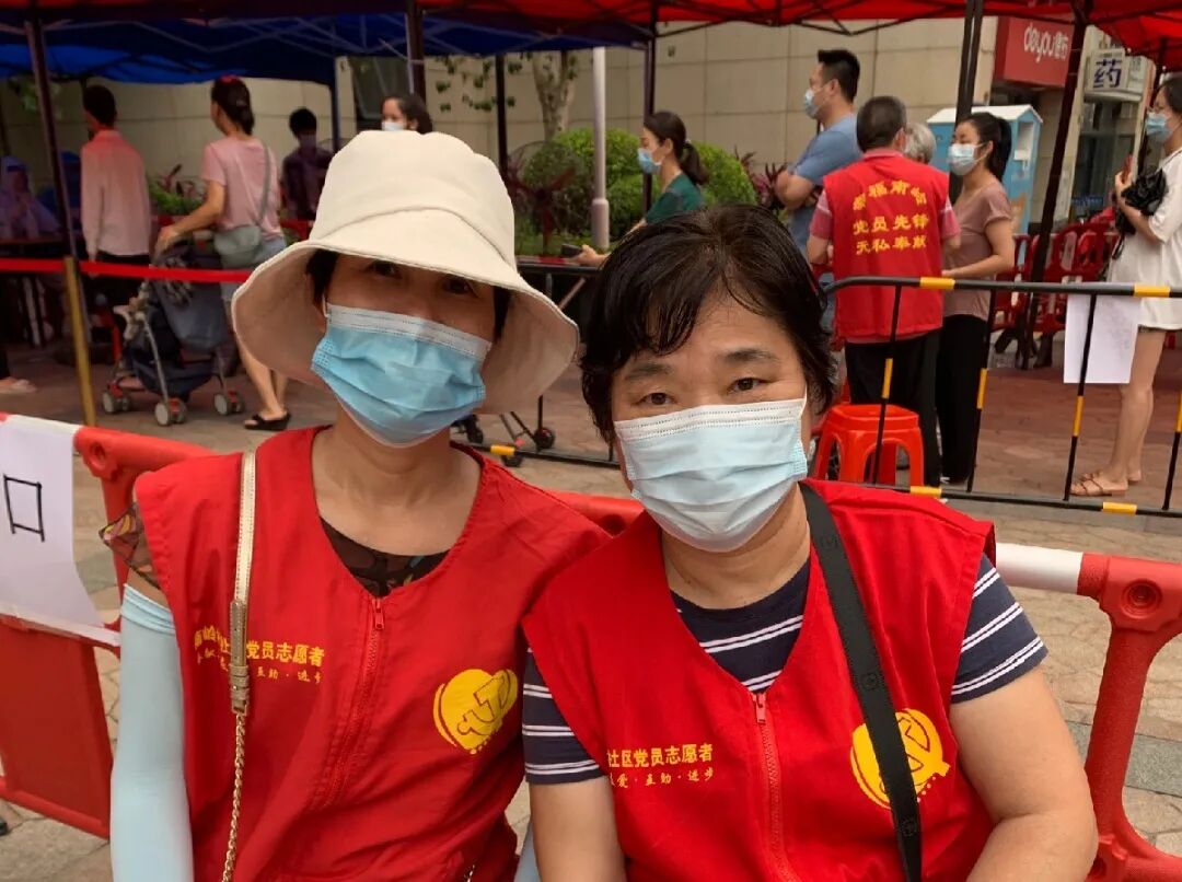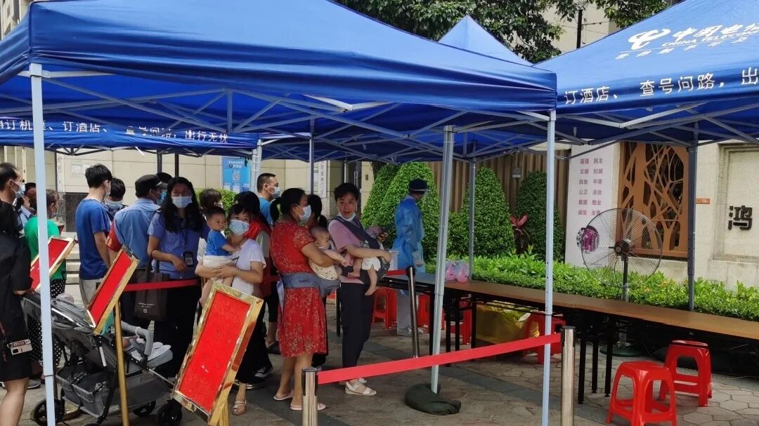 每走几步,管家和秩序维护员就会提示居民出示健康码,放行绿码者,志愿者会帮助扫码登记。道路一边,还免费供水处和红色凳子,但很少有人前去休息;孕妇、抱小朋友的家长可以先行。整个队伍井然有序,确保核酸采样队高速运转。