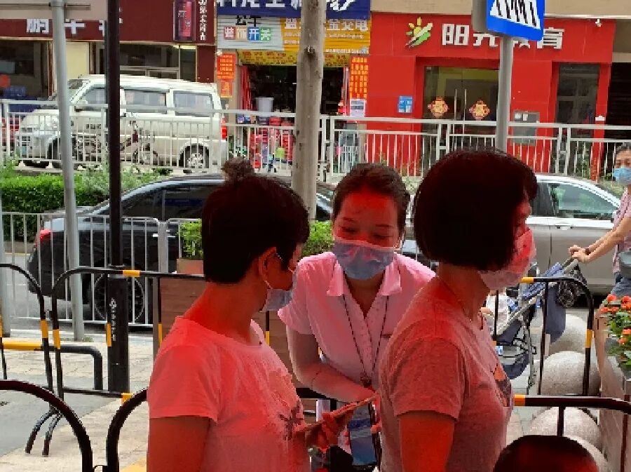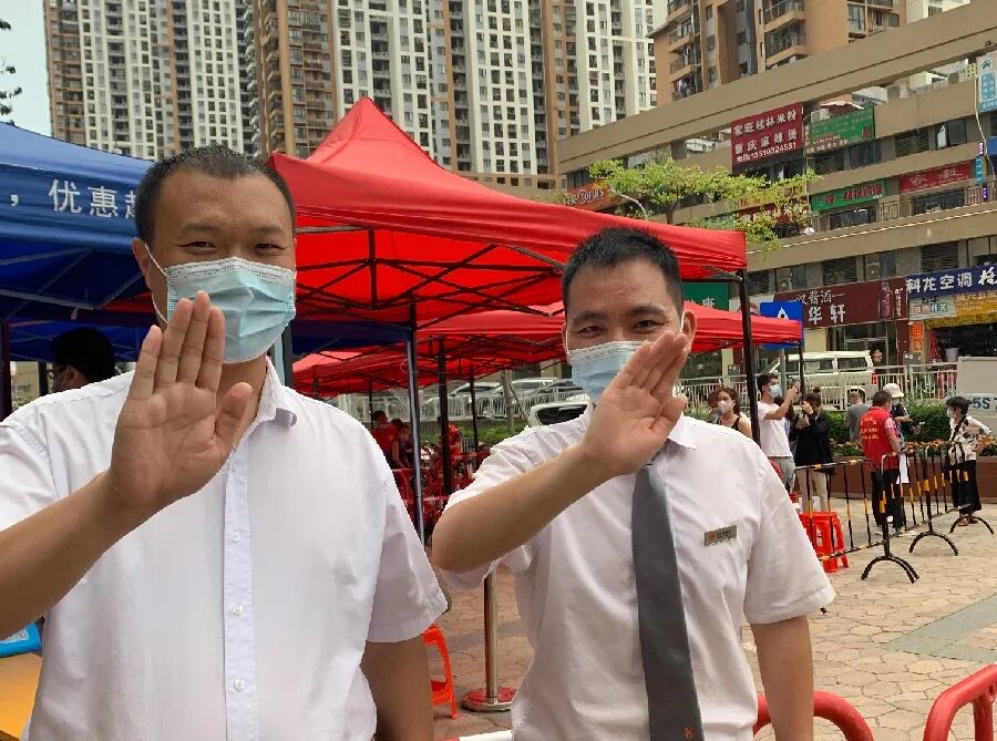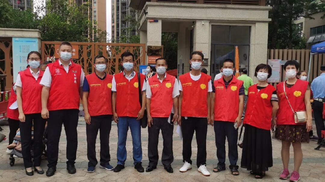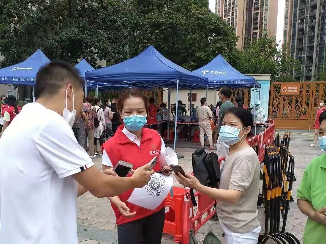 检测现场,由尚峰党支部与志愿者、物业服务中心三方合力,全力配合医护人员。从党员到小区志愿者,从项目负责人到管家、秩序维护员、行政文员,大家纷纷扛起肩上的使命担当,主动接受集中培训上岗,进行维护秩序、提醒居民进行信息登记、出入口指引等工作。
