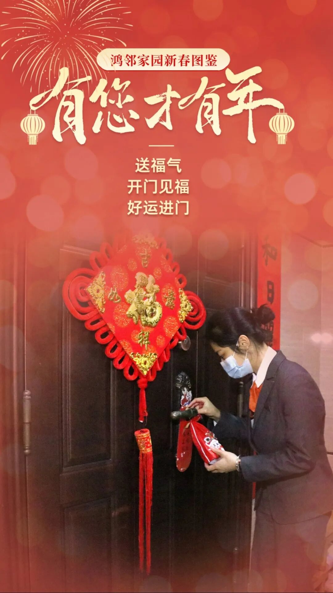 迎春送福暖人心,除夕之夜物业工作人员将精心准备的福袋和福运贴送上家门,为鸿邻家人们带来春节的祝福和关怀。