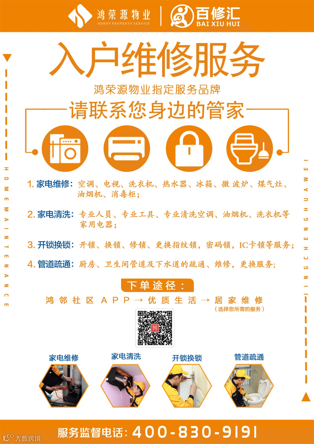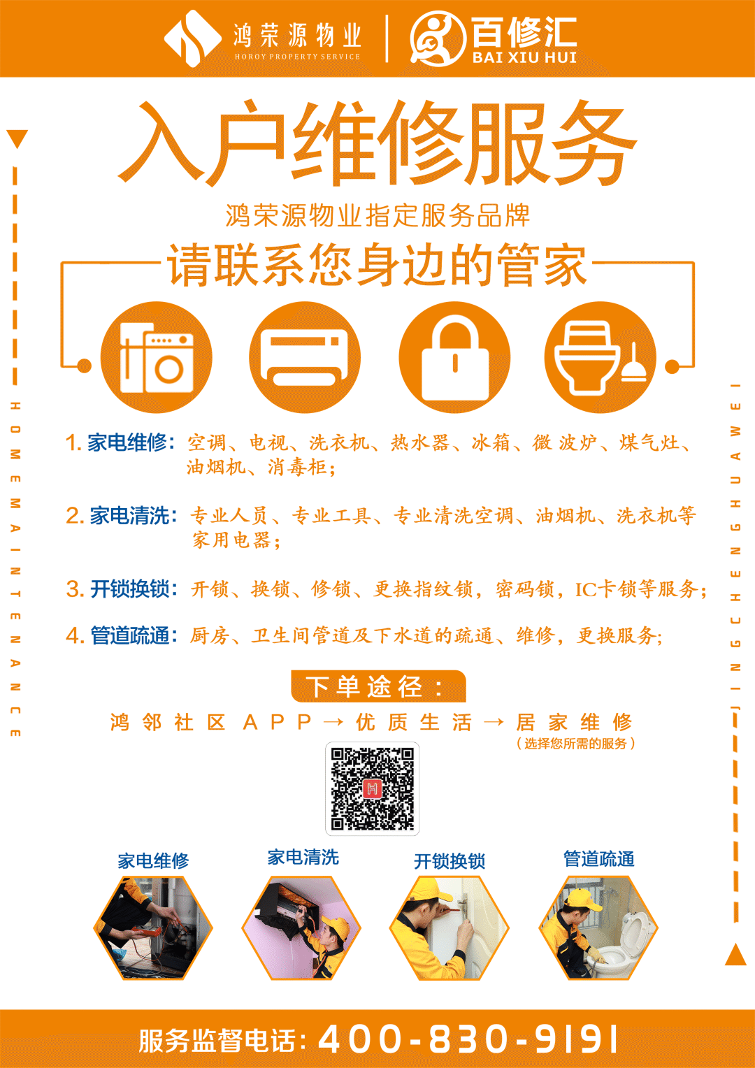 在社区生活服务领域,鸿荣源物业坚持为解决客户日常烦恼,提升客户生活便利的服务原则,围绕客户家电维修需求推出“居家维修”服务,内容涵盖家电维修、家电清洗、开锁换锁、管道疏通四大居家生活服务。