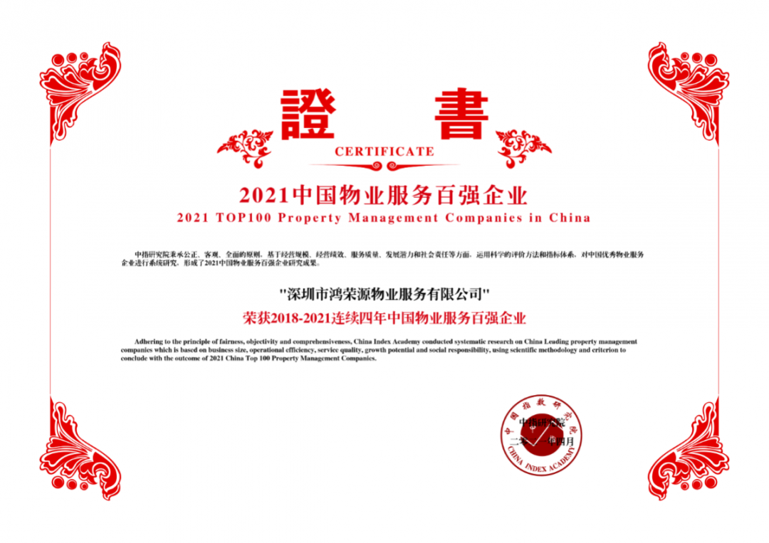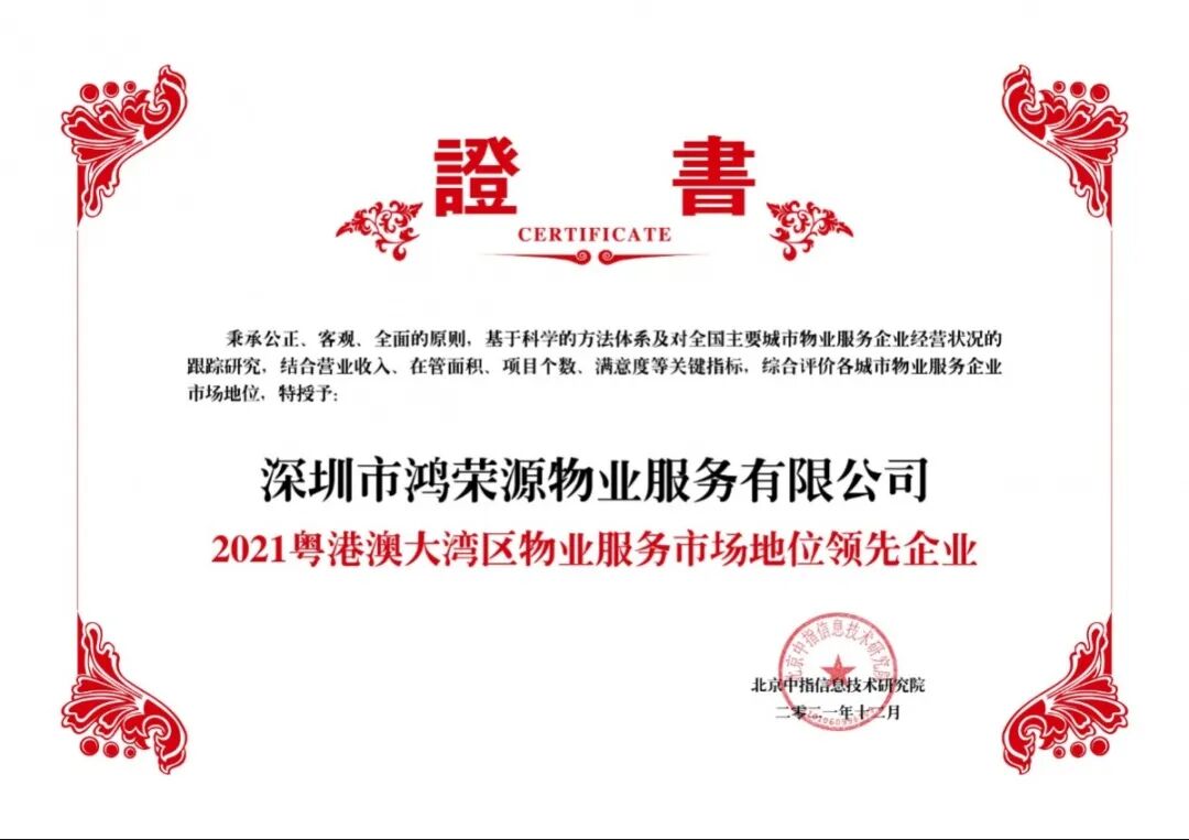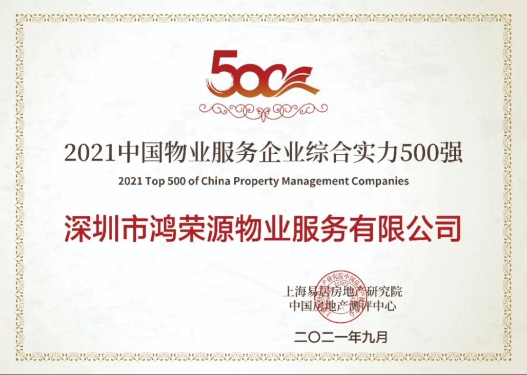 荣誉来自于责任和担当。2021年,鸿荣源物业先后荣获“2021中国物业服务综合实力500强”、“2018-2021连续四年中国物业服务百强企业”、“2021物业服务力百强“、“2021粤港澳大湾区物业服务市场领先地位”、“2021深圳市物业服务综合实力百强”等多项荣誉,品牌知名度稳步上升。