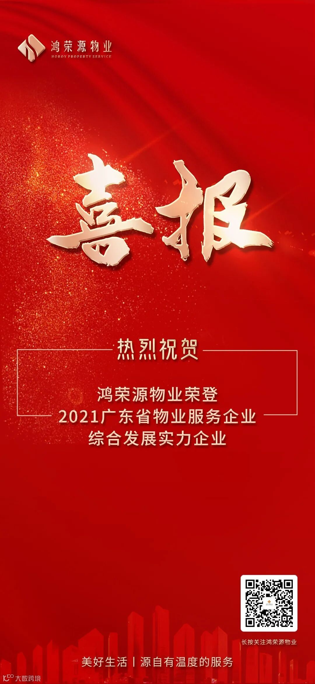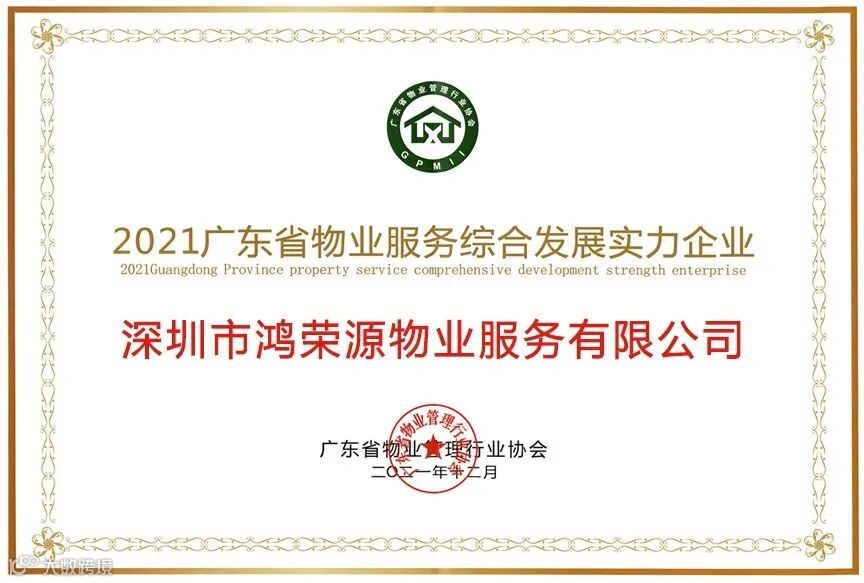 2021年12月15日,在广东省物业管理行业协会举办的“第五届第五次会员(代表)大会暨理事(监事)会会议”上重磅发布“2021广东省物业服务企业综合发展研究成果”,鸿荣源物业荣登“2021广东省物业服务综合发展实力企业”。