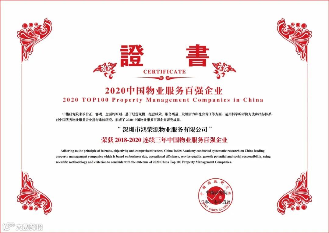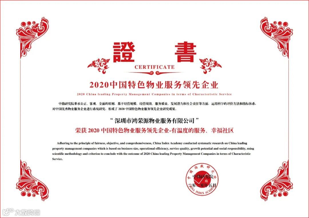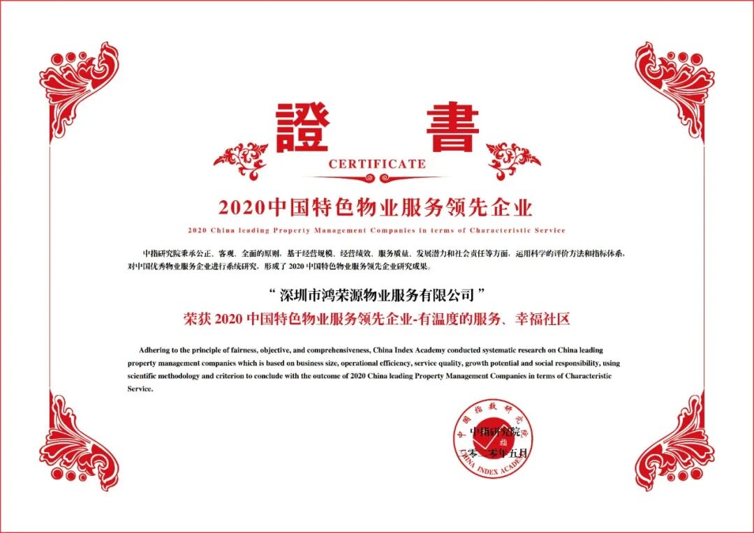 鸿荣源物业凭借高品质的物业管理、专业的服务体系,荣获“2018-2020 连续三年中国物业服务百强企业”以及“2020 中国特色物业服务领先企业-有温度的服务、幸福社区”。