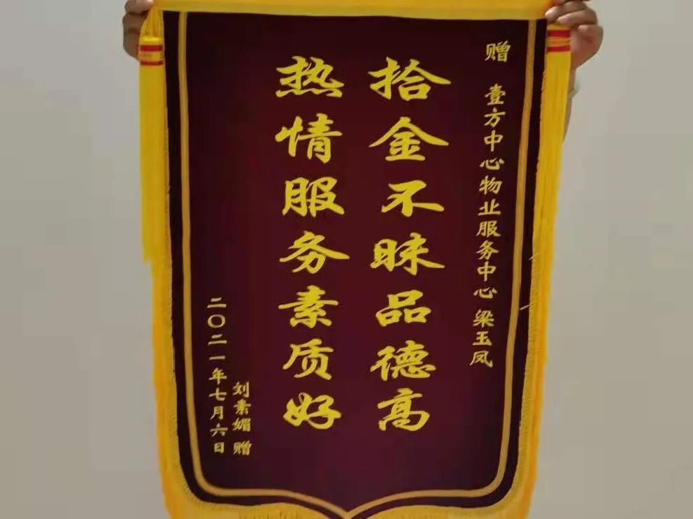 “一直在工作,完全没有注意手机不见了,不成想手机竟然主动来找我了,真是太谢谢你们了!”拿着短暂失联的手机,刘女士连连称赞物业工作人员拾金不昧精神,当即下单制作了一面锦旗,第二天就将这份表扬送到了梁玉凤的手里。