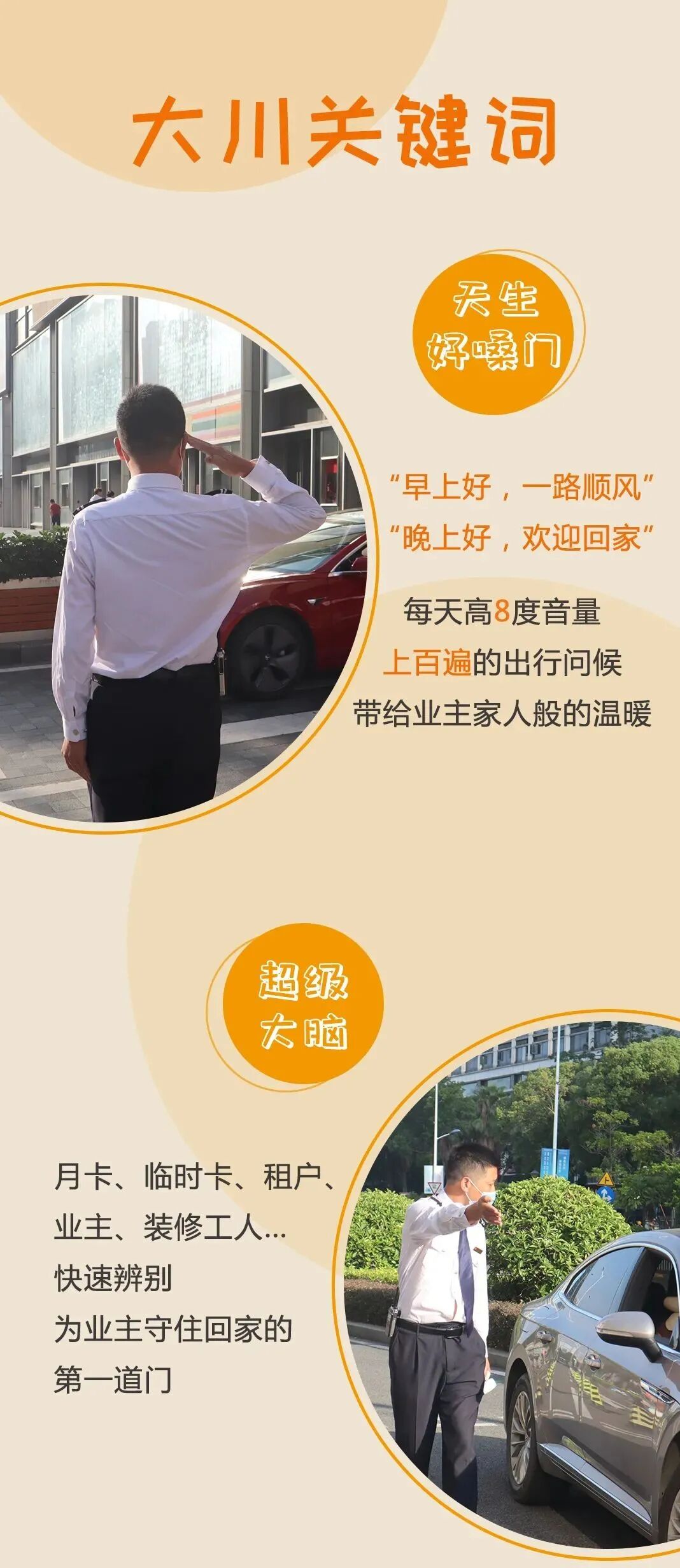 在大川眼里他就认准两个字——认真,认真站好每一班岗,是身为秩序维护员应该有的态度。在这个平凡的岗位上,他时刻以饱满热情迎接每一位业主,这份认真与坚持,不仅传递给了身边的同事,也感染着小区的业主。