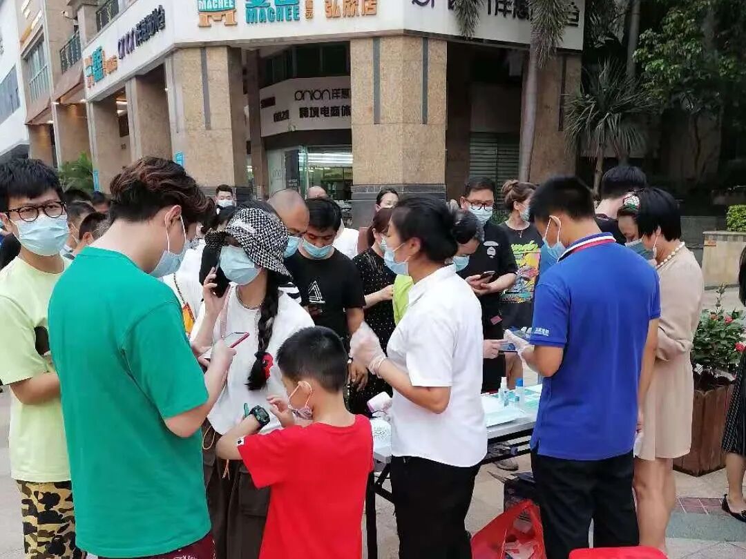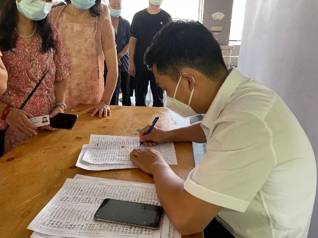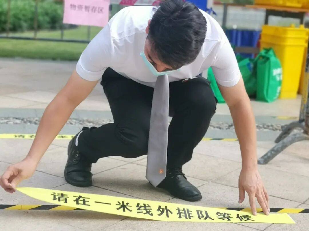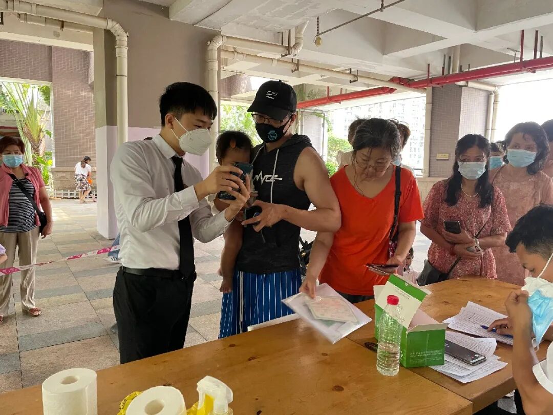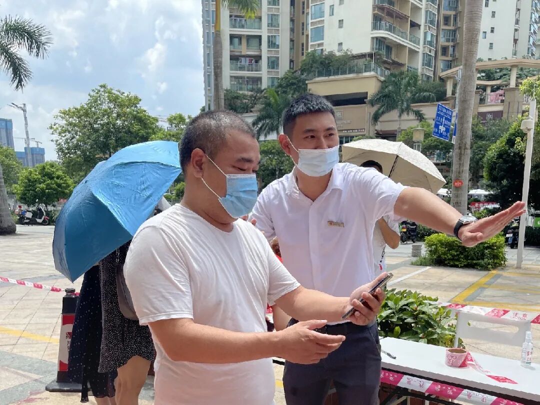▲西城雅筑全员出动,秩序维护员在协助工作站登记居民信息,管家拿出手机指导业主扫码,提升取样效率。