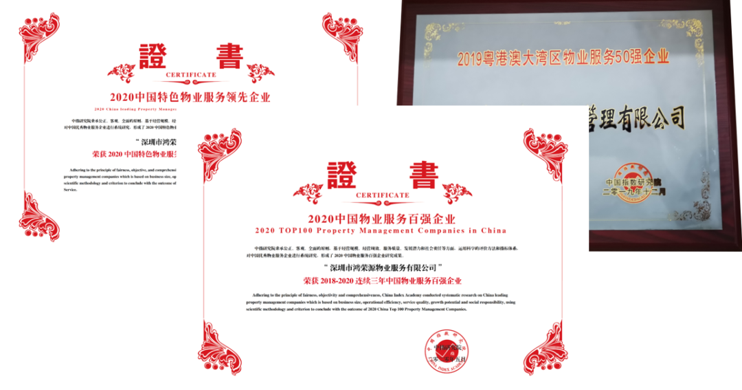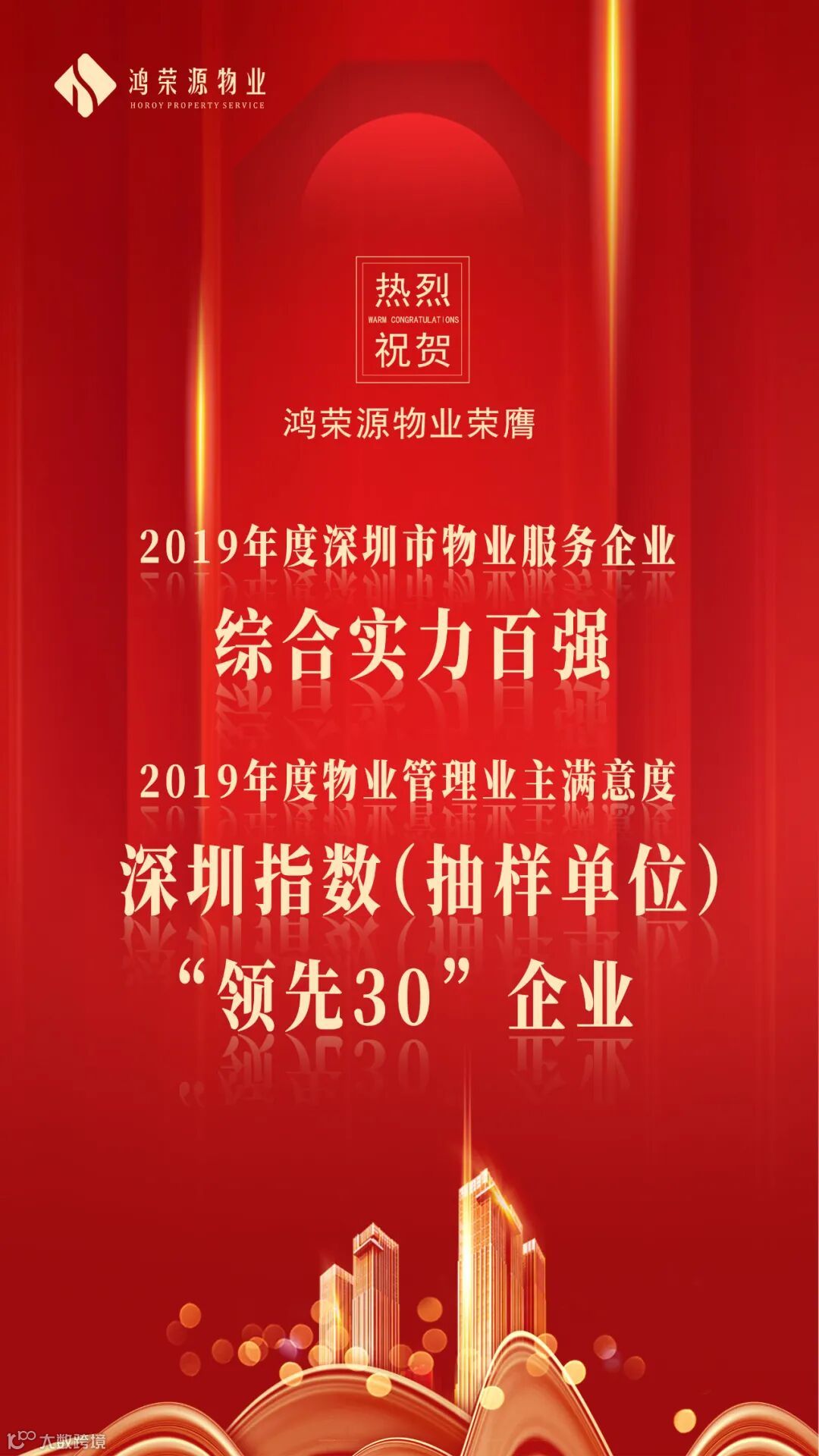 临近国庆,鸿荣源物业捷报频传。2020年9月25日,在深圳市物业管理行业协会六届六次会员代表大会上,经过6个维度、超百条标准综合考评,鸿荣源物业凭借出色的管理服务水平及综合实力在深圳众多物业企业中脱颖而出,荣获“2019年度深圳市物业服务企业综合实力百强”,并获得“物业管理业主满意度(住宅类)深圳指数(抽样单位)领先30”两项大奖。