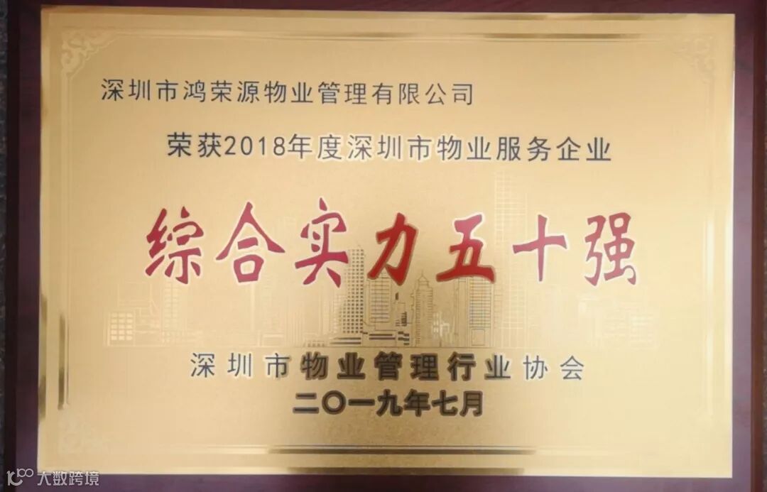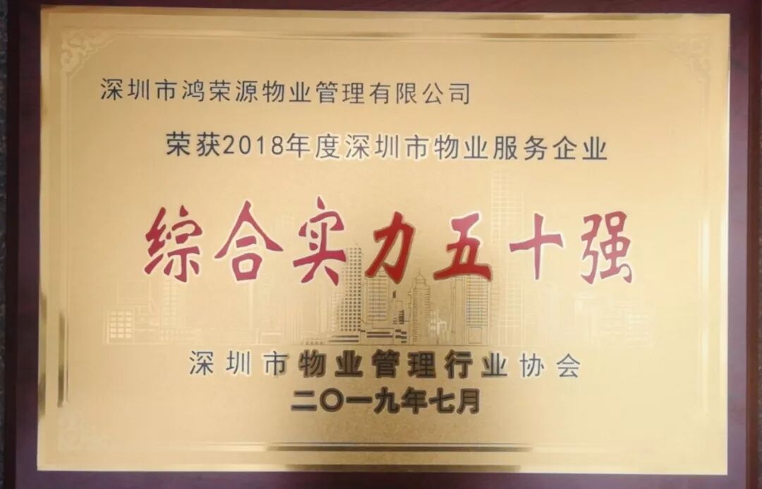 2019年7月15日,深物协六届七次常务理事、理事会议在深圳市罗湖区文锦北路文锦广场五楼艺嘉国际厅隆重召开。鸿荣源物业凭借深厚的综合实力和服务水平荣膺"2018年度深圳市物业服务企业综合实力50强",充分展现行业与客户对鸿荣源物业实力和品牌的高度认同。