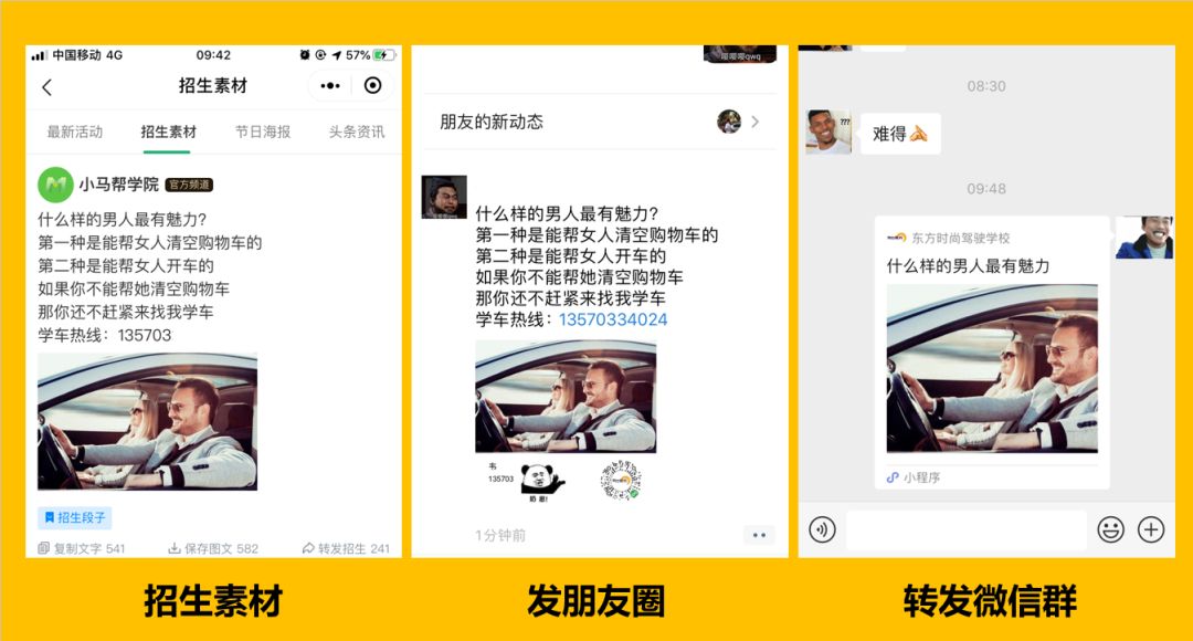 教练只需要上去选择合适的招生素材,可以一键发送到微信群里,或复制发送到朋友圈,因此教练只需要利用空余的时间寻找一些微信群就能轻松引流。