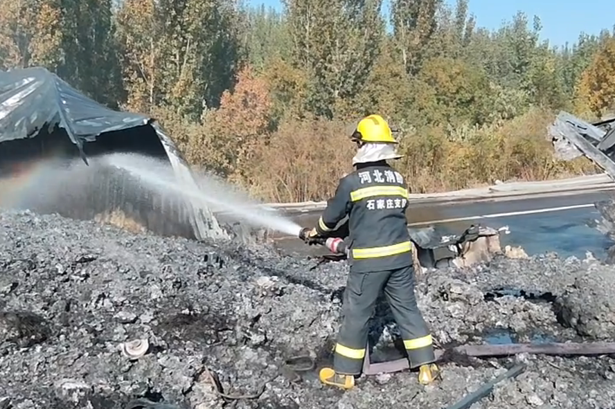 民警到达现场后立即采取临时交通管控措施,并协助消防部门进行灭火,经多方努力大火终于被扑灭,此时货车残骸一半在路面上,一半斜躺在右侧边沟内,经过吊装转运,路面恢复正常通行。据驾驶人自述,其有20年的货车驾驶经验,此次与同事一起从天津拉运百货前往广东清远,自己驾车行至此处时车辆突然爆胎失控,一阵猛烈摆动后径直撞向护栏,随后货车车厢发生自燃,休息中的同事连鞋都没来得及穿就急忙从侧翻的货车内逃出。