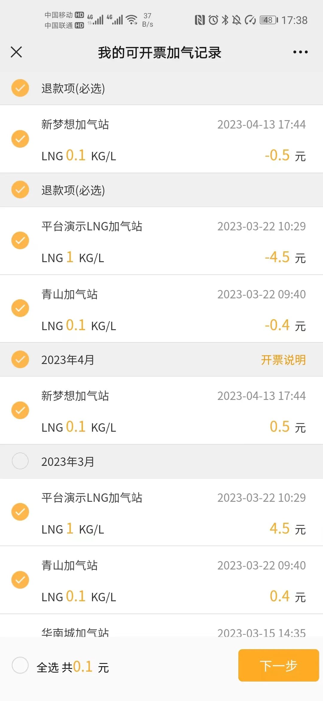 点击【申请开票】,即可进入【我的可开票加气记录】页面。选择订单后,点击【下一步】。