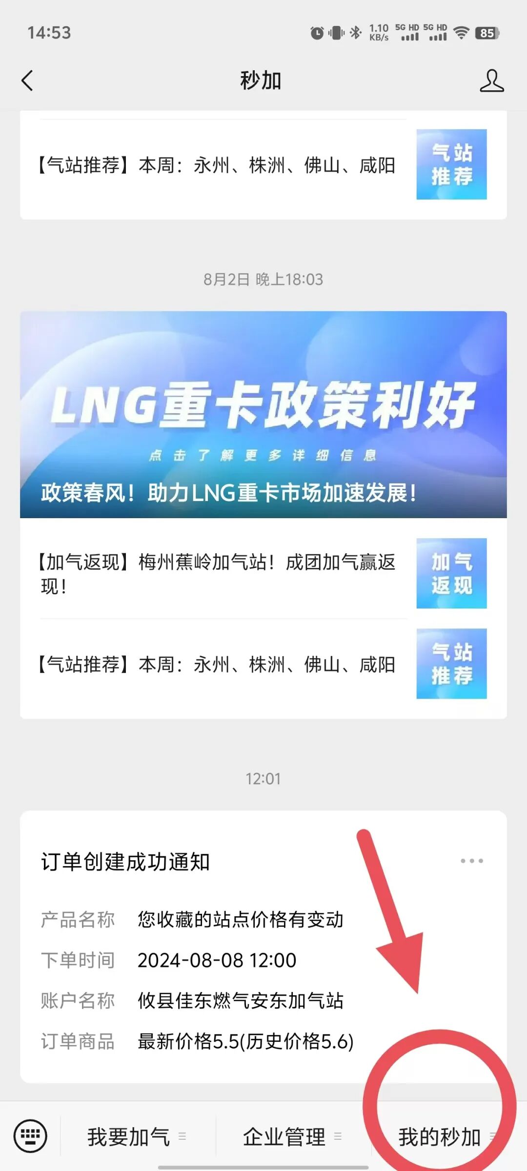我们在加气后,扫码付款。付款之后在个人账户中会生成一个订单。