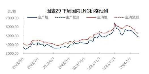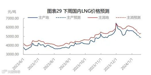 供应层面来看,气温较为温和,部分工厂保供任务完成,下周国产工厂产量有提产预期。需求层面来看,部分物流车辆提前放假,车用需求收缩。且下游制造业有减产以及停产可能,工业需求同样收缩。整体来看,在供应宽松需求疲弱基本面下,预计下周国内LNG价格延续跌势。