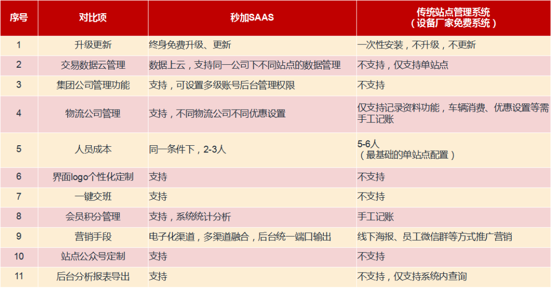 秒加SaaS系统针对传统站点“降本、增效”的切实需求,依托移动互联网、 物联网、云存储等技术,深度优化站点日常工作流程,让员工操作更便捷、工作更流畅,经营管理决策数据可视化,搭建客户会员体系提供多种营销策略,售后“一对一”服务。