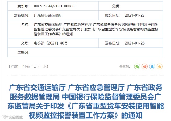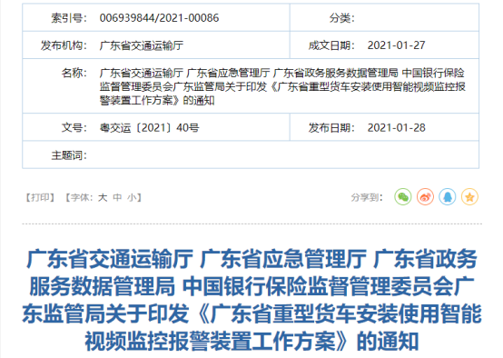 此前,广东省交通厅发布了《广东省重型货车安装使用智能视频监控报警装置工作方案》的通知。