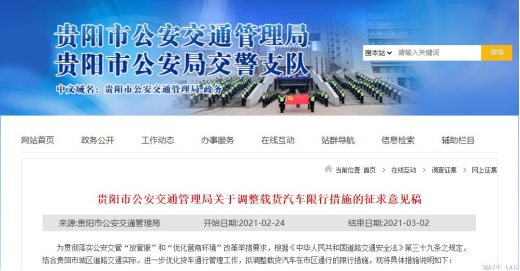 贵阳市公安交通管理局发布了《关于调整载货汽车限行措施的征求意见稿》,指出:贵阳市将进一步优化货车通行管理工作,调整载货汽车在市区通行的限行措施。其中皮卡实行早、晚高峰限行(早高峰:7点至9点、晚高峰:17点至19点),其余时间段不限行。