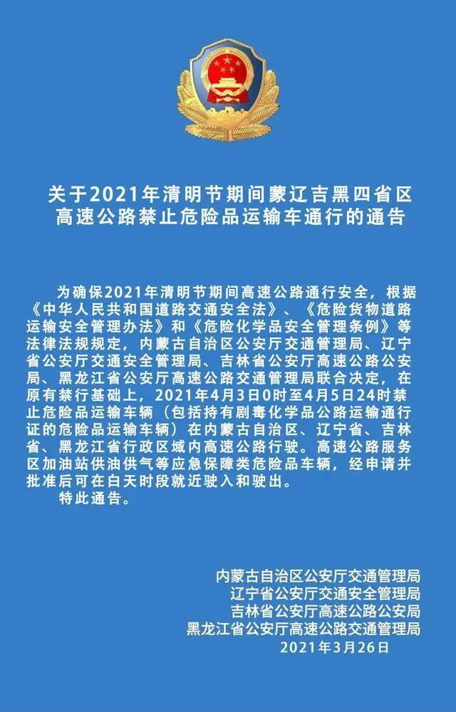 为确保2021年清明节期间高速公路通行安全,根据《中华人民共和国道路交通安全法》、《危险货物道路运输安全管理办法》和《危险化学品安全管理条例》等法律法规规定,在原有禁行基础上,2021年4月3日0时至4月5日24时禁止危险品运输车辆(包括持有剧毒化学品公路运输通行证的危险品运输车辆)在内蒙古自治区、辽宁省、吉林省、黑龙江省行政区域内高速公路行驶。