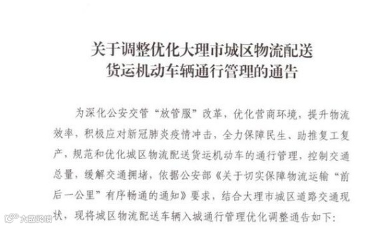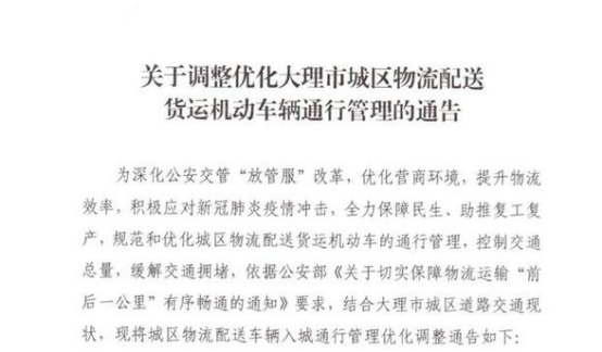 今年一月份,云南省大理市发布《关于调整优化大理市城区物流配送货运机动车辆通行管理的通告》,对于以下车辆,给予24小时全区无限制通行许可,具体标准为:“核载质量2吨(含)以下的轻型封闭、箱式物流配送货运机动车辆。”