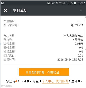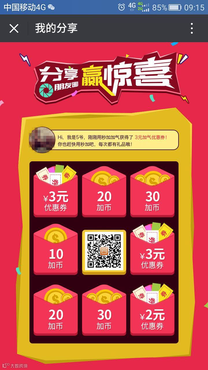 2、用户每次使用秒加支付气款成功后分享即可获得秒加送出的奖品。