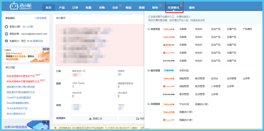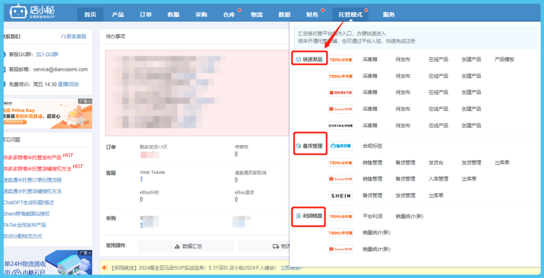 无论是全托管还是半托管,卖家都可以在店小秘 ERP 首页导航栏一站式操作,实现从平台入驻、产品刊登,备货管理、打单发货、库存管理、利润核算及数据统计的多店铺全流程运营闭环,无需来回切换,简化操作流程,助力卖家高效工作!