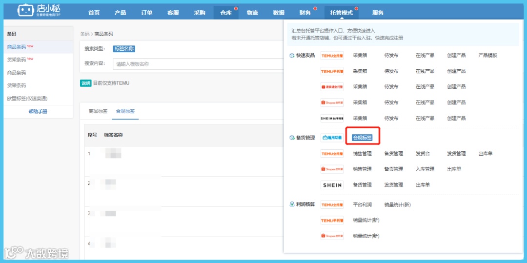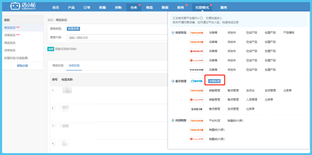 通过“托管模式”这一入口,店小秘ERP可以完成平台入驻、产品刊登、备货管理、打单发货、库存管理、数据统计及利润核算等操作,实现TEMU、速卖通、卖家无需在不同模块间来回切换,简化操作流程,大幅提升运营效率。