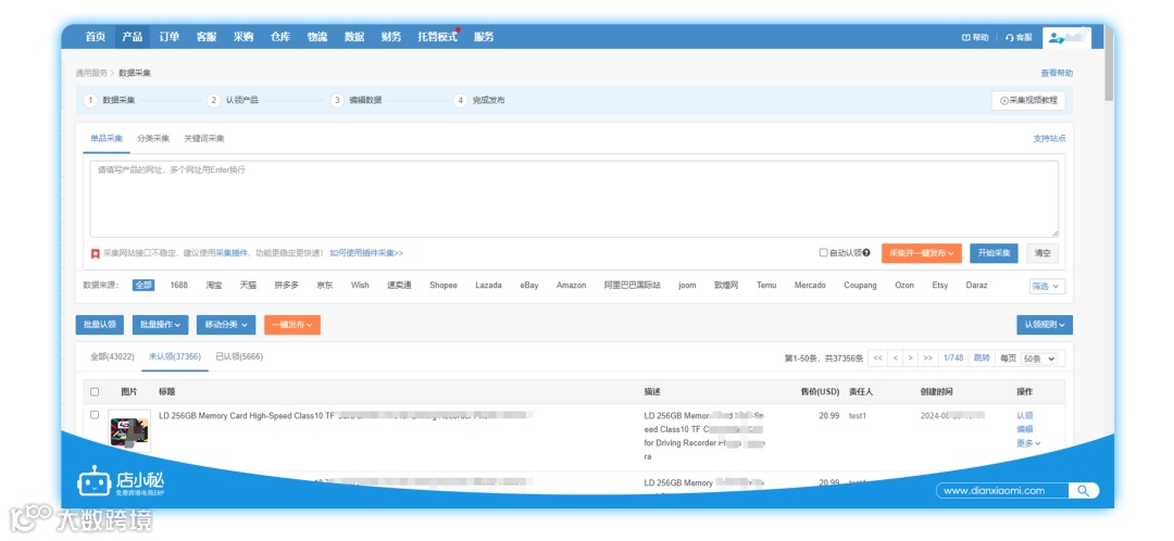 可在系统内直接采集100+电商平台/站点的商品信息,一键或者批量认领至草稿箱,再根据自身需求,利用上述提及的小工具快速编辑商品信息,随后一键发布。