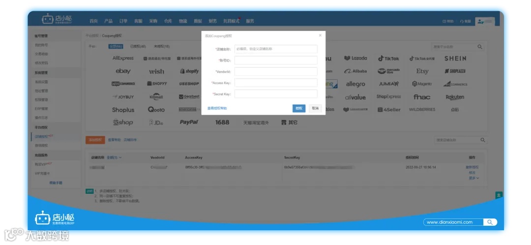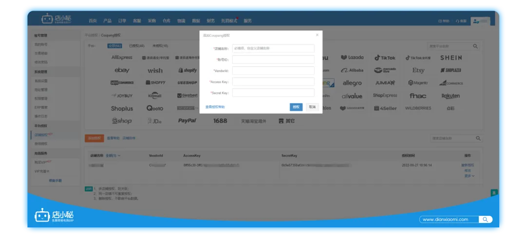 登录Coupang后台,将店铺管理权限授权给店小秘ERP,方可使用采集、刊登功能。路径参考:【店小秘主账号—用户名—平台授权—Coupang—重新授权—填写账号ID等信息,授权】