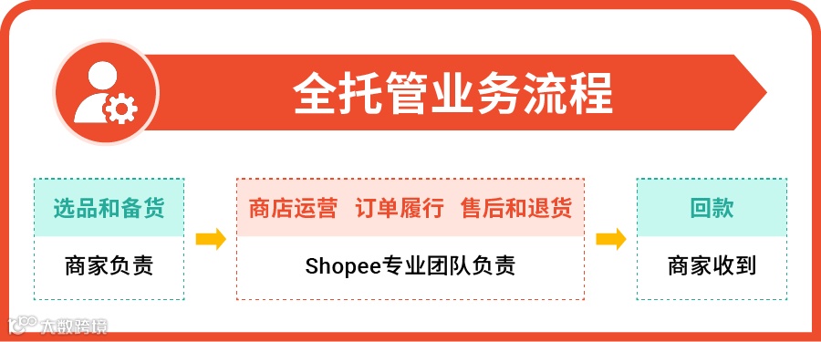从业务流程来看,Shopee 全托管卖家只需专注选品备货,平台将提供产品定价、上架优化、店铺营销运营、流量投放、物流履约及售后退货等服务。