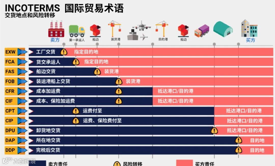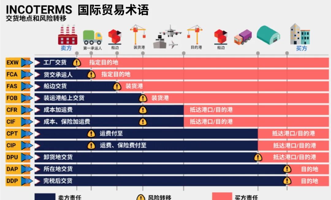EXW=工厂交货价(出了工厂后的所有费用都由购买方负责;风险点:出了工厂大门,货物风险也由买方负责)